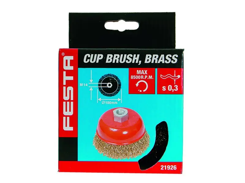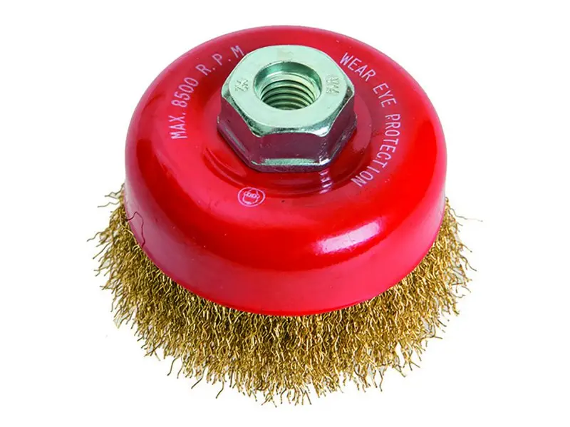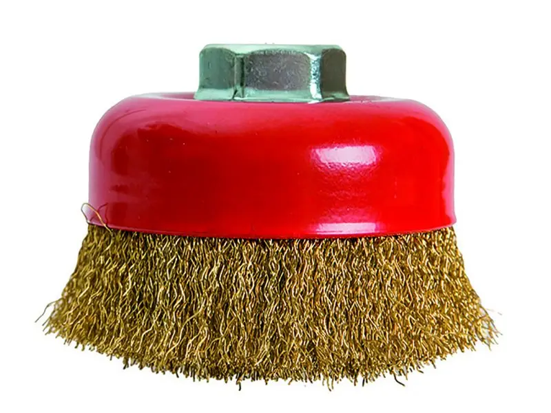 Kartáč miskový s mosaznými vlnitými drátky, uchycení M14, hrnkový, vhodné pro nerezové materiály.