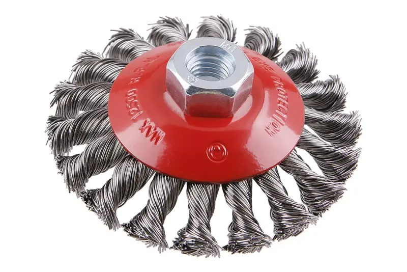 Rotační kartáč - miskový, provedení : COPY - patentovaný drát 0,5 mm - copy, se ani při extrémním zatížení nerozplétají, průměr 100mm, závit M14x2 mm, počet drátů: 900, délka drátu : 23 mm, max. přípustné otáčky: 12500 1/min, použití : odstranění barvy, rzi, otřepů, zbytků po svařovení, strusky, zdrsňování, čištění kovoých součástí, balení papírový box s eurootvorem.