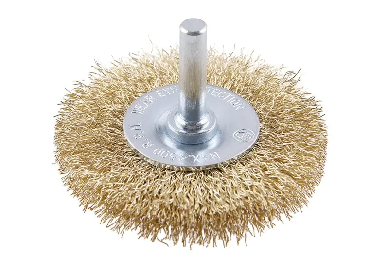 Rotační kartáč - okružní, provedení : vlnitý drát 0,25 mm - pomosazený, průměr 60mm, stopka 6 x 27 mm, pozinkované tělo kartáče, počet drátů : 1080, délka drátu : 15mm, max. přípustné otáčky : 4500 1/min, použití : pro leštění, zdrsňování, ostranění rzi a otřepů, balení : blistr s eurootvorem.