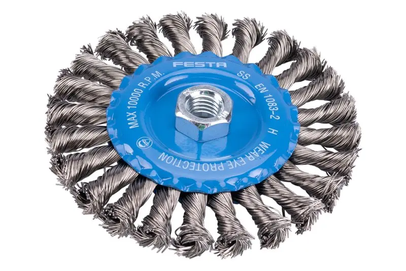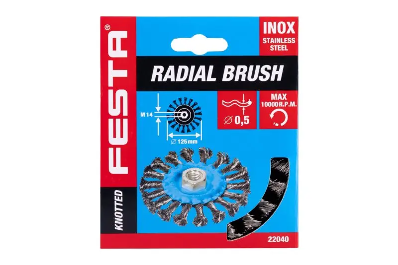 Rotační kartáč - radiální, provedení : COPY - patentovaný drát nerezová ocel 0,5 mm - copy, se ani při extrémním zatížení nerozplétají, kartáče FESTA zaručují kvalitní použité materiály i zpracování, průměr 125 mm, závit M 14 x 2 mm, pozinkované tělo kartáče, počet drátů : 1320, délka drátu : 27 mm, max. přípustné otáčky : 10000 1/min, použití : odstranění barvy, rzi, otřepů, zbytků po svařovení, strusky, zdrsňování, čištění kovoých součástí, balení papírový box s eurootvorem.