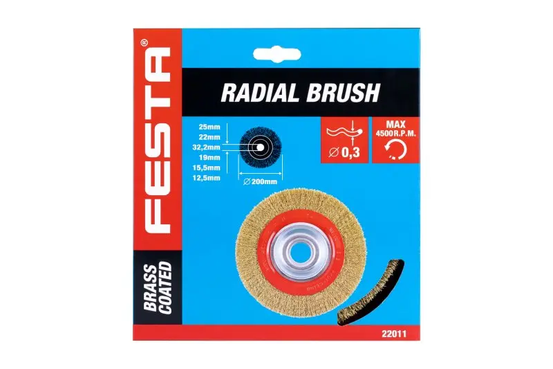 Rotační kartáč - okružní, provedení : vlnitý drát, kartáče FESTA zaručují kvalitní použité materiály i zpracování, drát 0,3mm - pomosazený, průměr 200mm, uchycení otvor 32mm (včetně redukčních kroužků 12,7 mm - 1/2, 15,8 mm - 5/8, 19 mm - 3/4, 22,2 mm a 25,4mm - 1), počet drátů 8000, délka drátů 34 mm, maximální otáčky za min. 4500, vhodný pro zámečnické a kovoobráběcí práce, odstraňování rzi, barev, leštění.… , balení : plastový box.