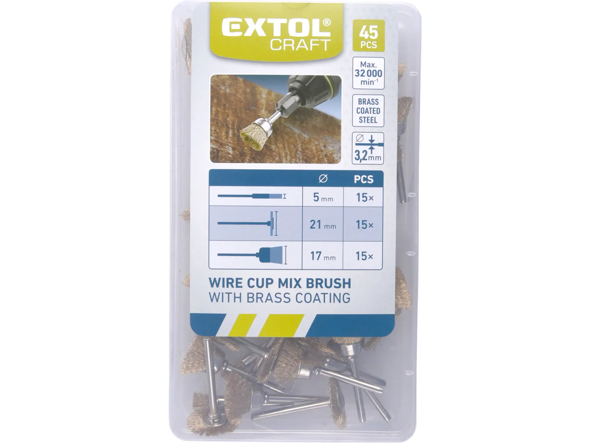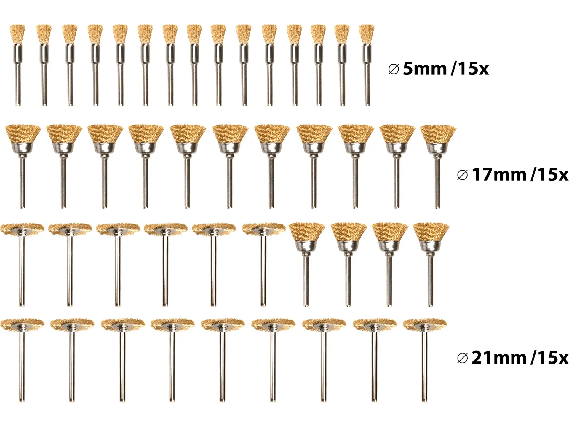 kartáče: ⌀5mm - 15x, ⌀17mm - 15x, ⌀21mm - 15x, stopka ⌀3,2mm, pomosazený vlnitý drát, plastová krabička