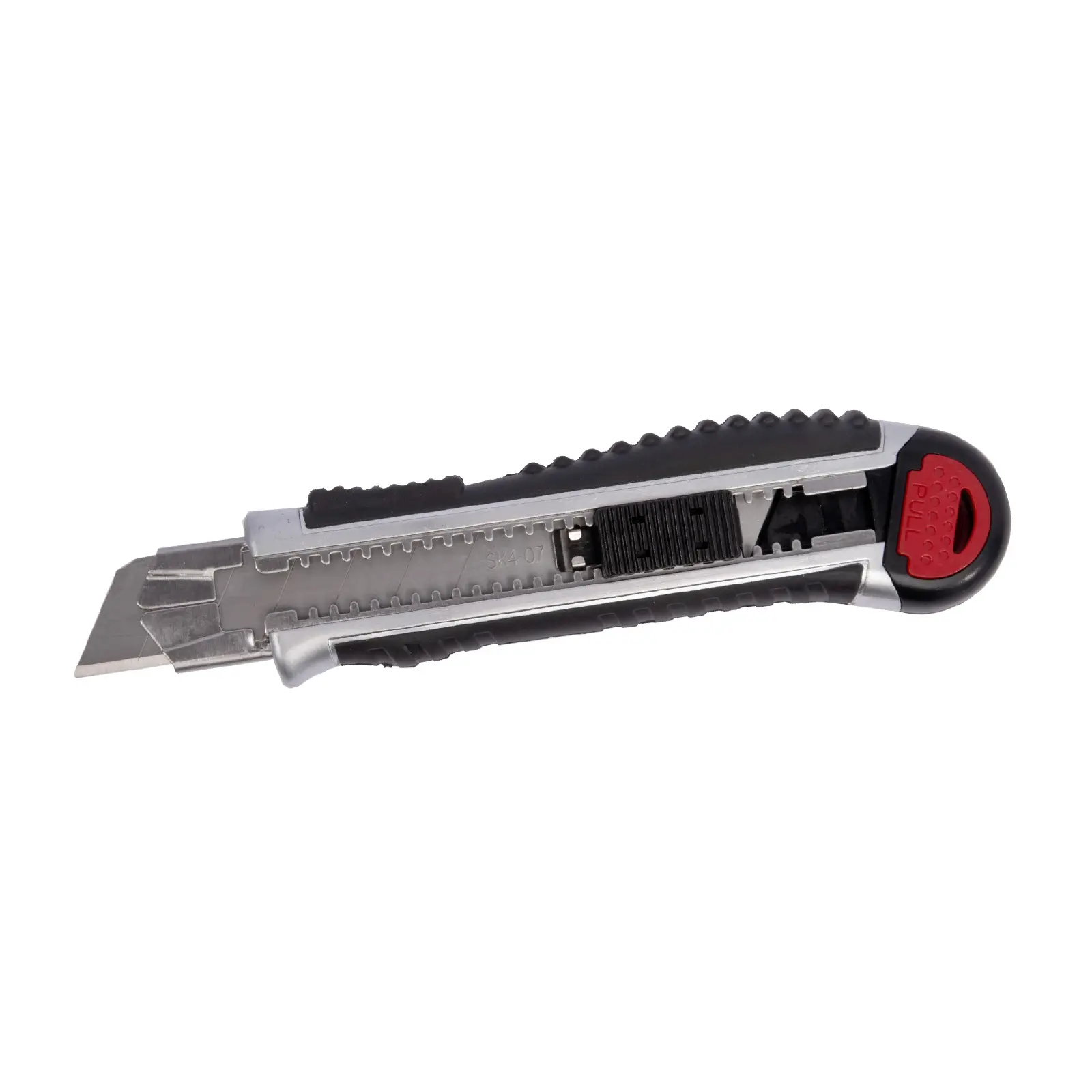 Celokovový ulamovací nůž s kovovou vodící lištou a pryžovým pláštěm. Ocelové vodítko čepele se vždy automaticky uzamkne proti pohybu a umožňuje rychlou výměnu náhradní čepele přímo ze zásobníku. Pogumovaná rukojeť s drážkami proti prokluzu. Vysouvač slouží jako zámek a rychlé výměně břitu. Vysouvací zásobník s 5 náhradními čepelemi.