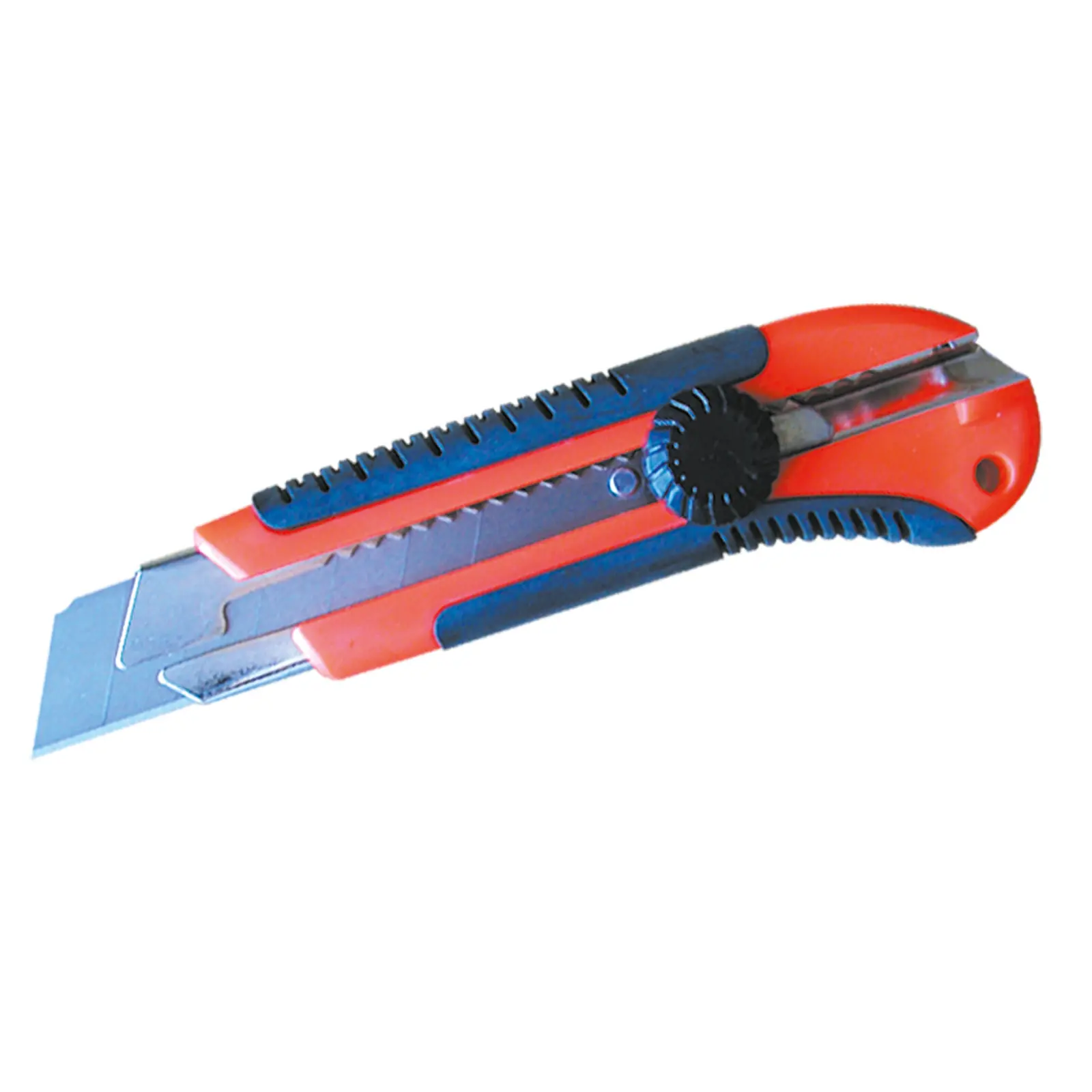 Ulamovací plastový nůž s pogumovanou rukojetí a kovovou lištou.