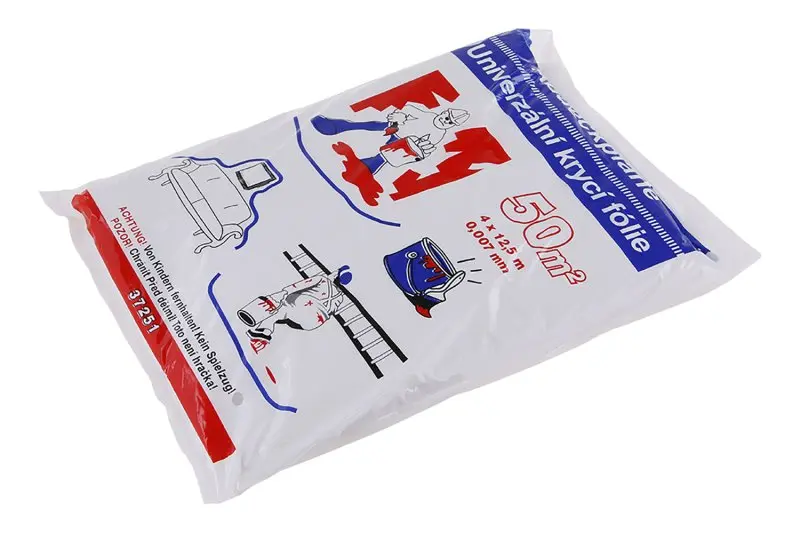 Univerzální krycí folie, rozměr : 4 x 12,5 m - tloušťka 0,007 mm, použití : jako ochrana ploch, nábytku proti znečištění.