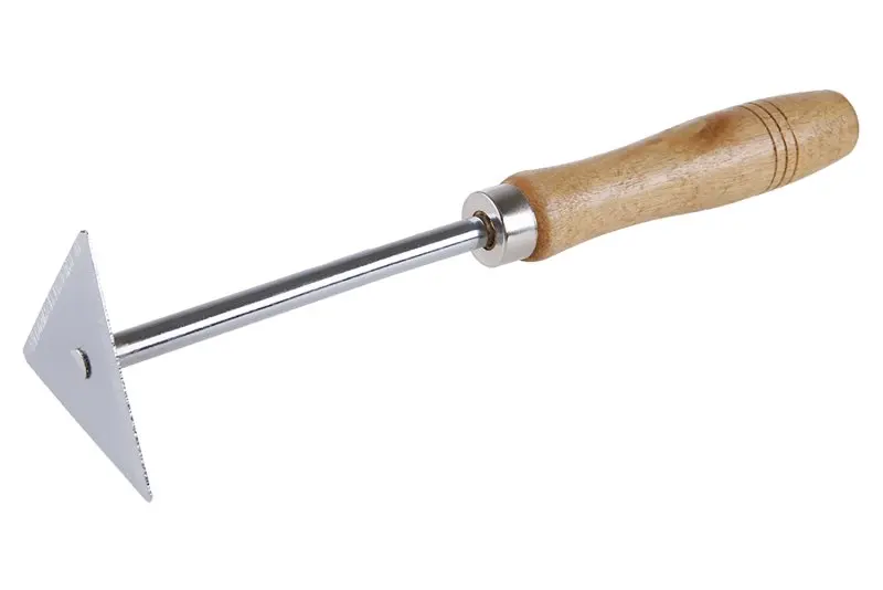 Škrabka na barvy a laky, použití: na škrabání barev a laků samostatně nebo v kombinaci s opalováním, trojúhelníkový tvar umožňuje odstranit nátěry i v huře přístupných místech, dřevěná ergonomická rukojeť zamuzuje vedení tepla při práci s horkým vzduchem nebo plamenem.