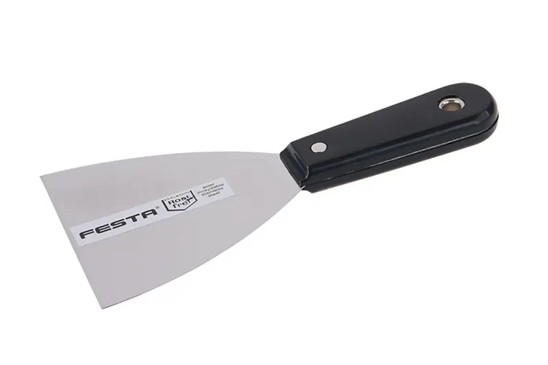 Špachtle nerezová FESTA 100 mm s plastovou ručkou. Je užíván ve štukatérství, malířství, natěračství, opravách karosérií nebo při umělecké tvorbě apod. Je vhodná pro roztírání sádry nebo jiných tmelících hmot či k odstraňování staré malby a nátěrů.