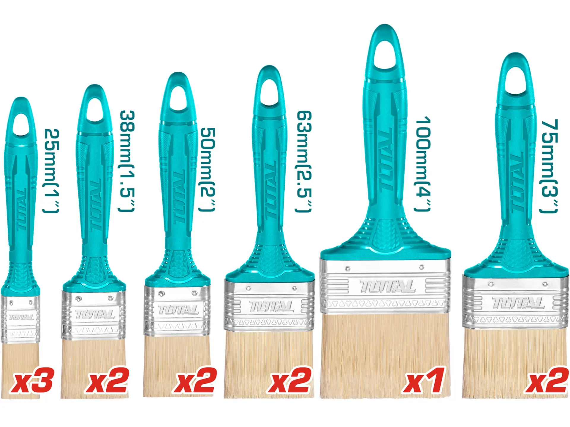 Sada 12ks štětců obsahuje: 3ks 25mm, 2ks 38mm, 2ks 50mm, 2ks 63mm, 2ks 75mm, 1ks 100mm