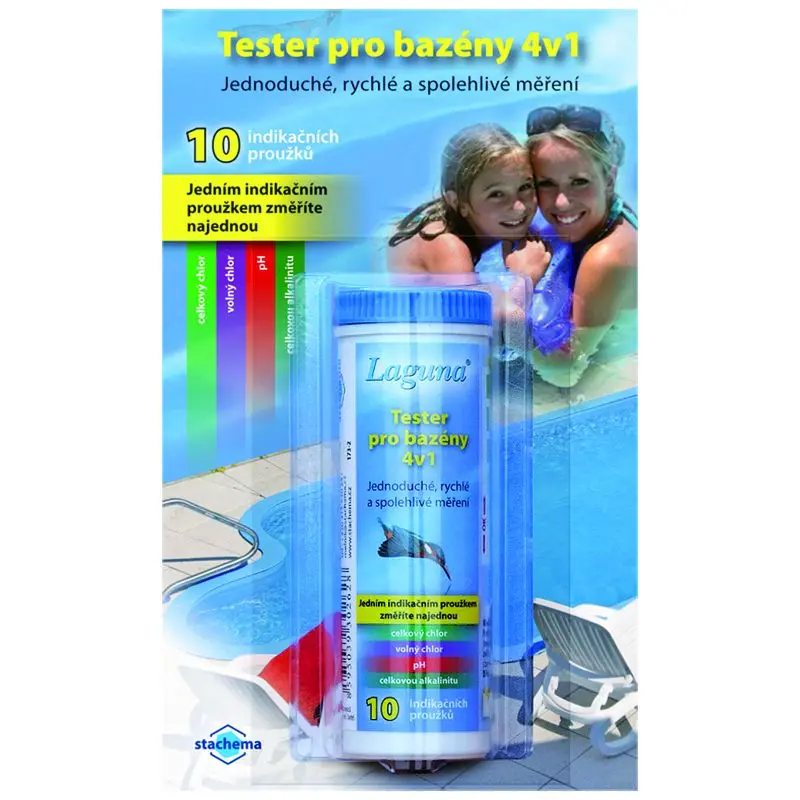 Tester slouží k měření hodnot pH, obsahu chloru (celkového+ volného) a celkové alkalinity v bazénové vodě