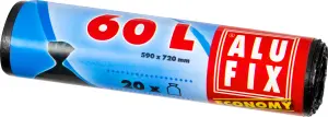 Černé praktické Alufix pytle na odpadky, silné 13 µ (mikronů), rozměr pytle 59 x 72 cm, objem pytle 60 l, balení 20 kusů. Jsou vyrobeny z polyethylenu s vysokou hustotou (HDPE).