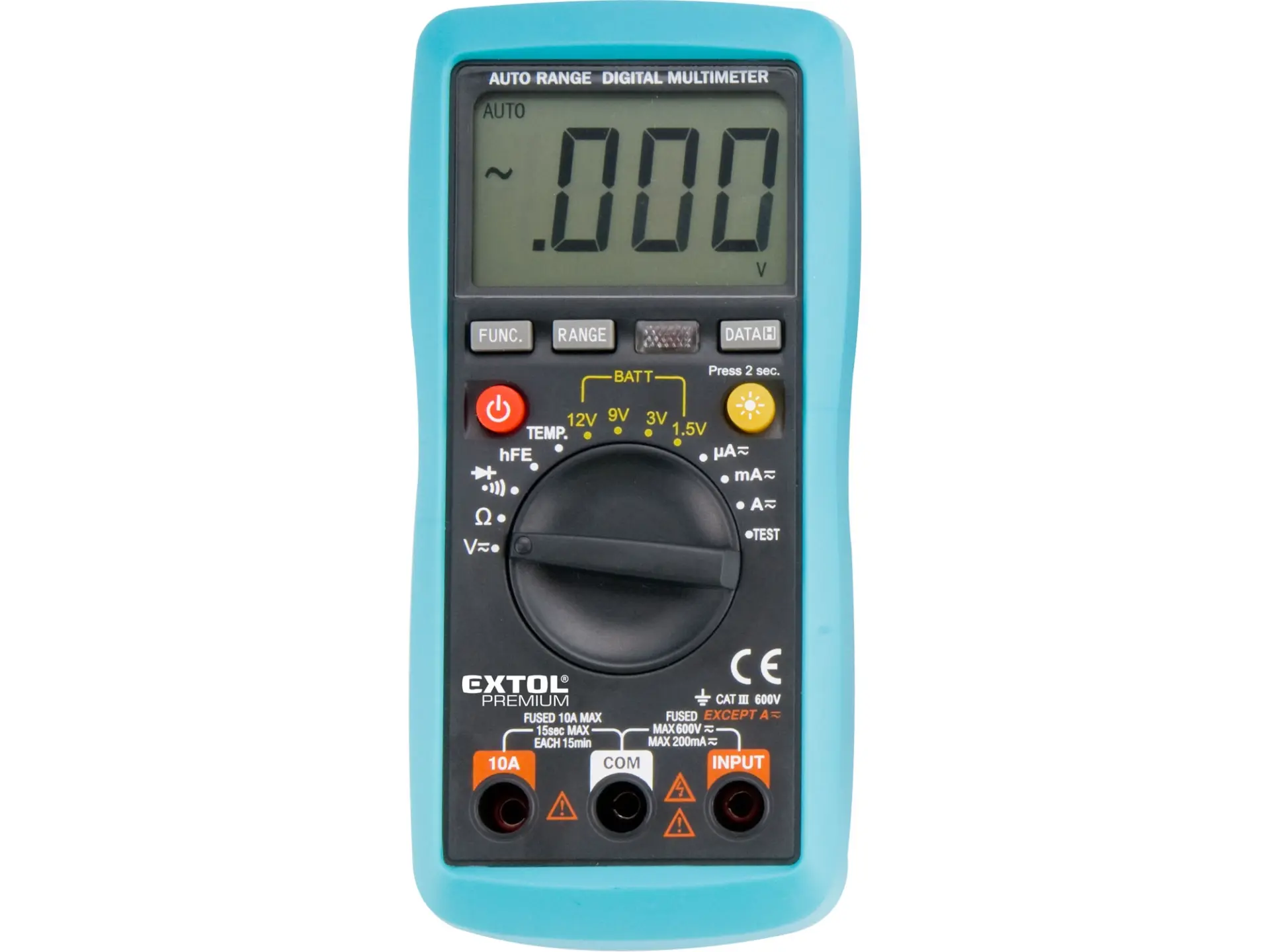 rozsah měření: DC napětí 200mV-600V, AC napětí 2V-600V, DC a AC proud 200µA-10A, odpor 200Ω-20MΩ, teplota -20°C-1000°C, test baterií 1,5/3/9/12V, test tranzistorů a diod, měření spojitosti obvodů