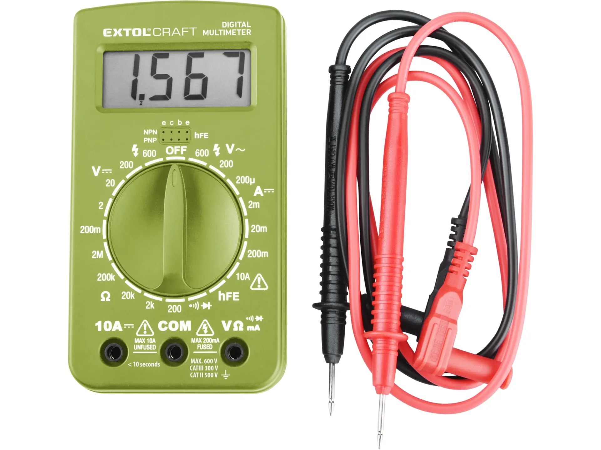 rozsah měření: DC napětí 200mV-600V, AC napětí 100V-600V, DC proud 200µA-10A, odpor 200Ω-2MΩ, test diod, s akustickou signalizací