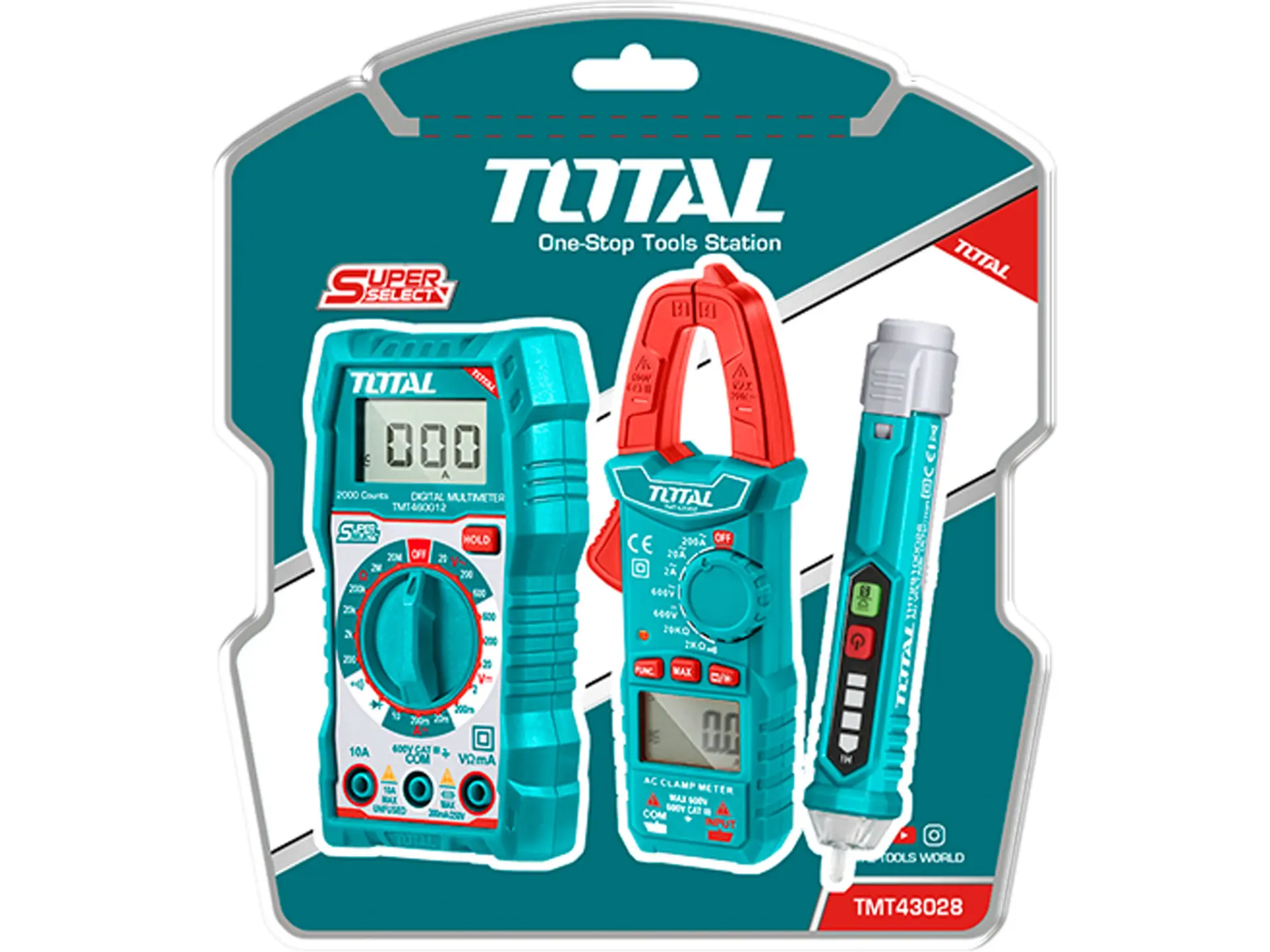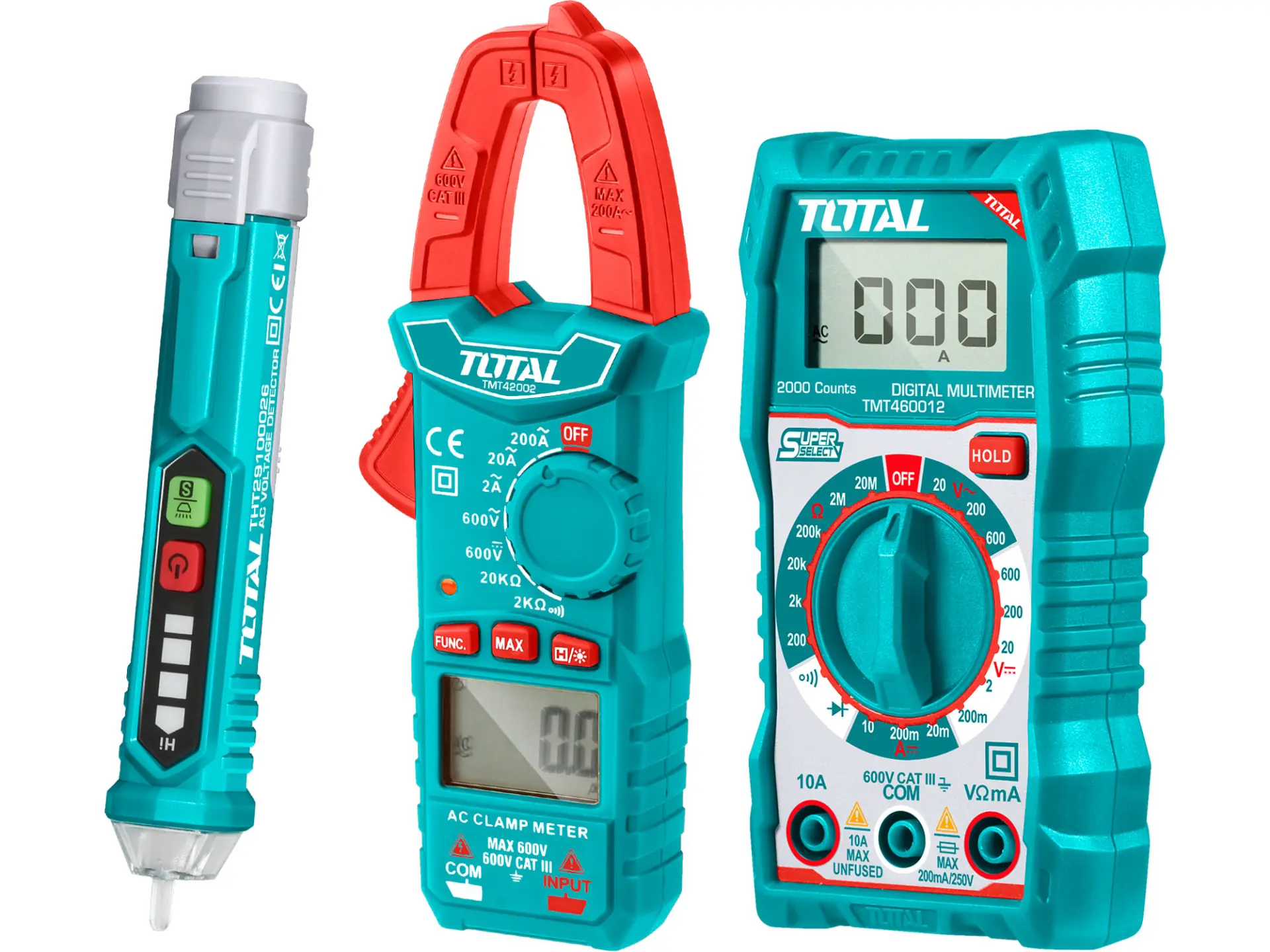 Sada digitálního multimetru, multimetru klešťového a zkoušečky AC napětí. Digitální multimetr kategorie CAT III má ochranu proti přetížení. Pracuje s maximálním napětím 600V. Vzorková frekvence je cca 3x/sec., automatická indikace polarity, pojistka F200 mA/ 250 V. Digitální klešťový multimetr je kategorie CAT III. Maximální napětí mezi svorkami a uzemněním je 600 V DC / 600 V AC. Max. zobrazená hodnota 6000. Ochrana proti přetížení.Zkoušečka AC napětí měří síťové napětí v rozsahu 12 - 1000 V. Frekvence je 50-60Hz. Zkoušečka disponuje světelnou a zvukovou signalizací, světlem, rozlišením nulového a živého vodiče, signalizací intenzity signálu a indikací nedostatečného napětí baterie.