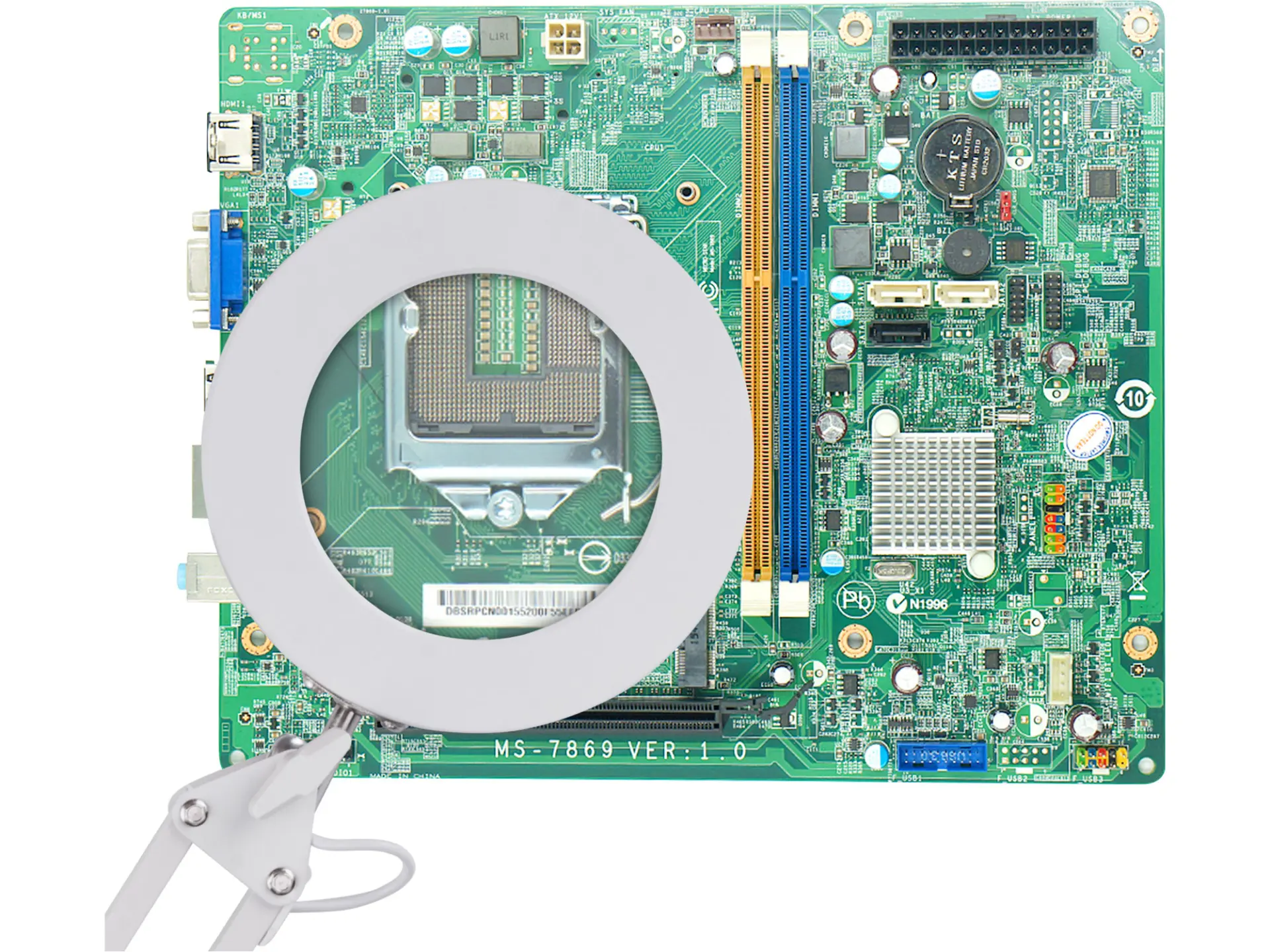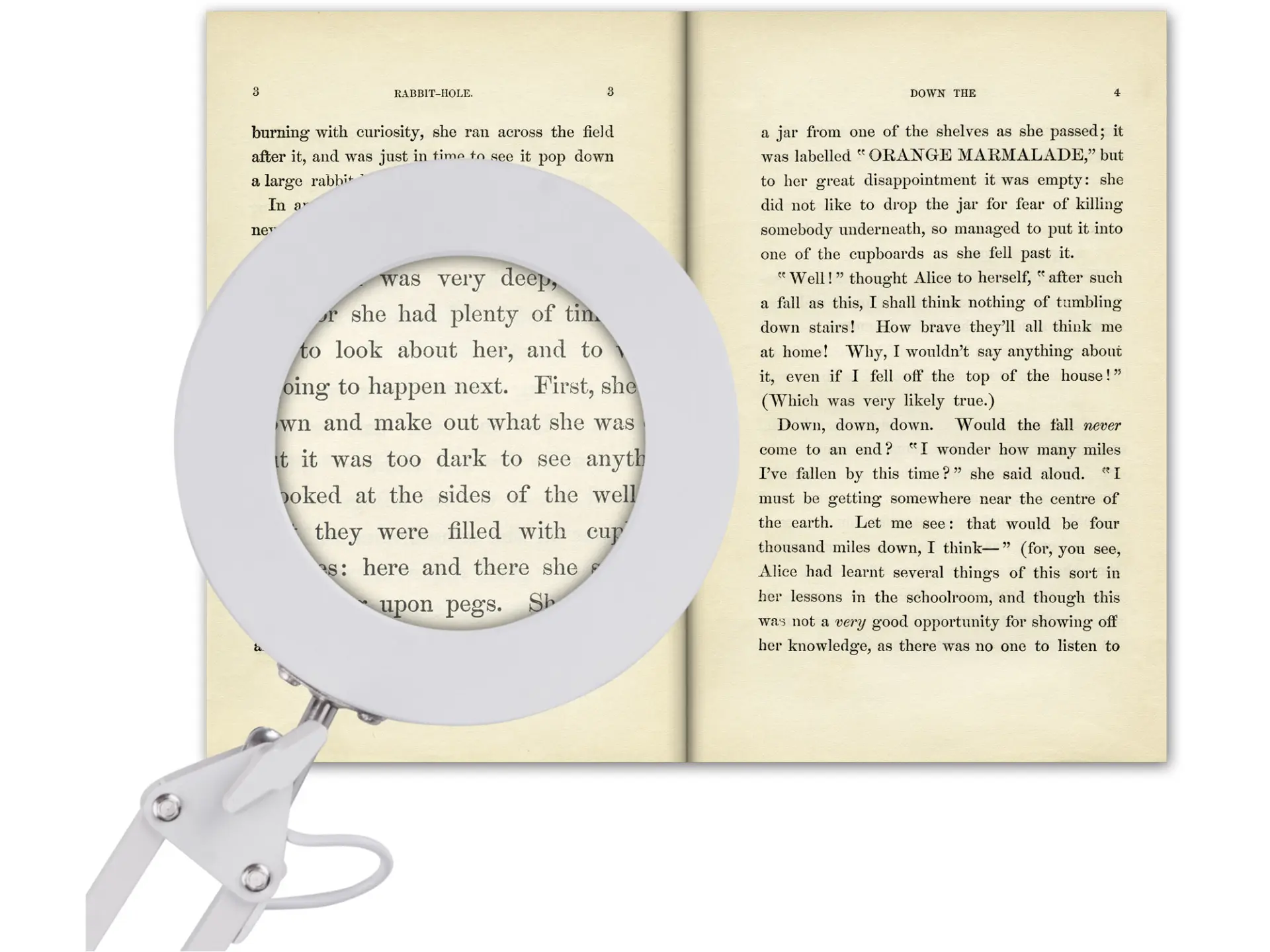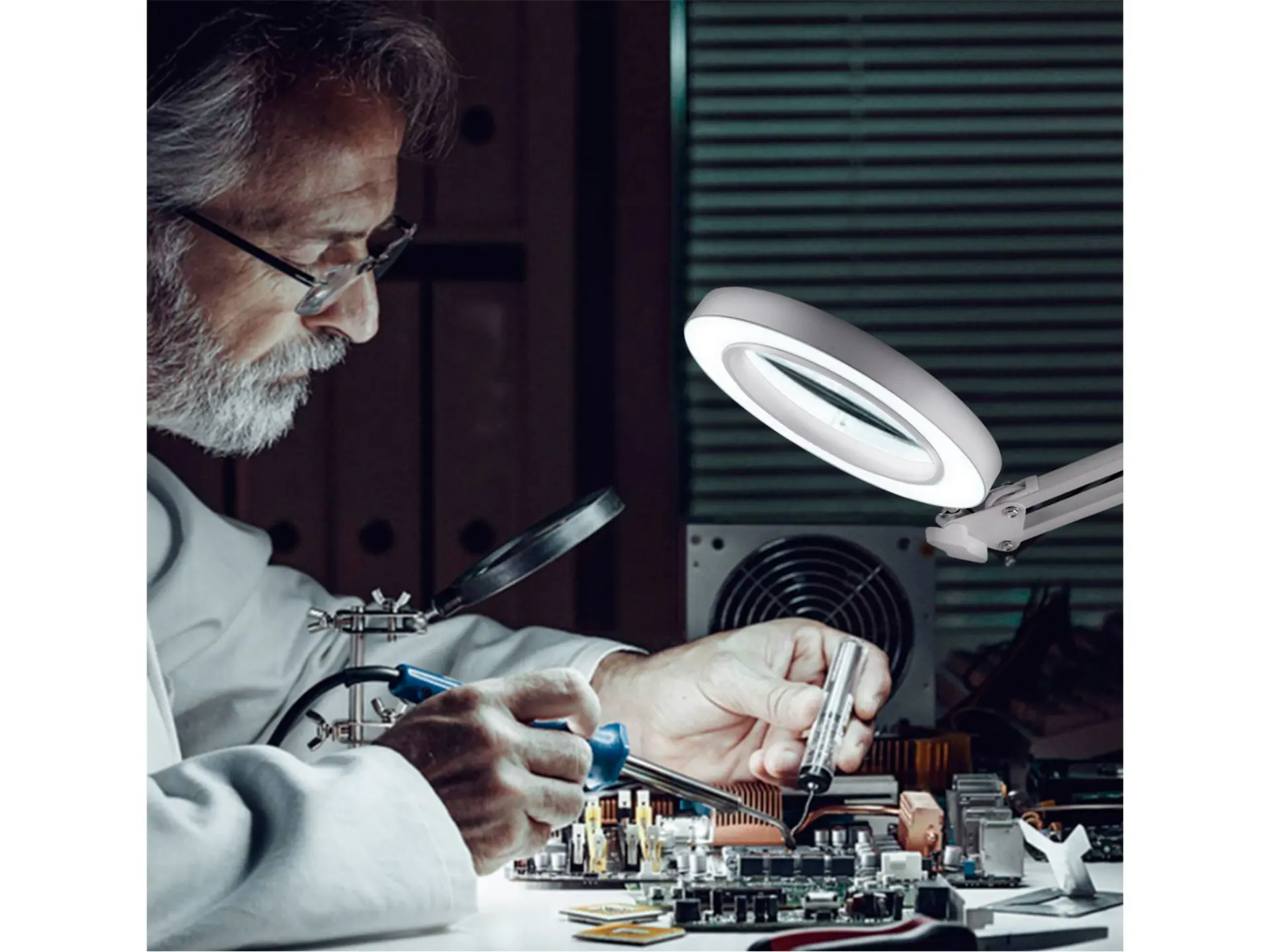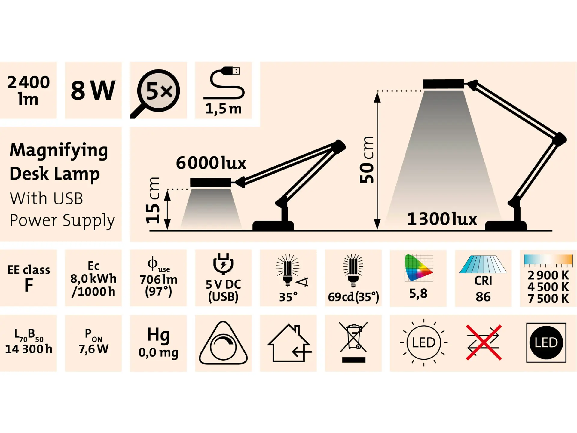 napájení 5V DC (USB), světelný tok – 15cm pod světlem: 9000lm, 50cm pod světlem: 1300lm, kabel 150cm, délka ramen 70,5cm, průměr lupy (skla) 10,5cm, průměr základny 19cm, hmotnost s podstavcem 2kg