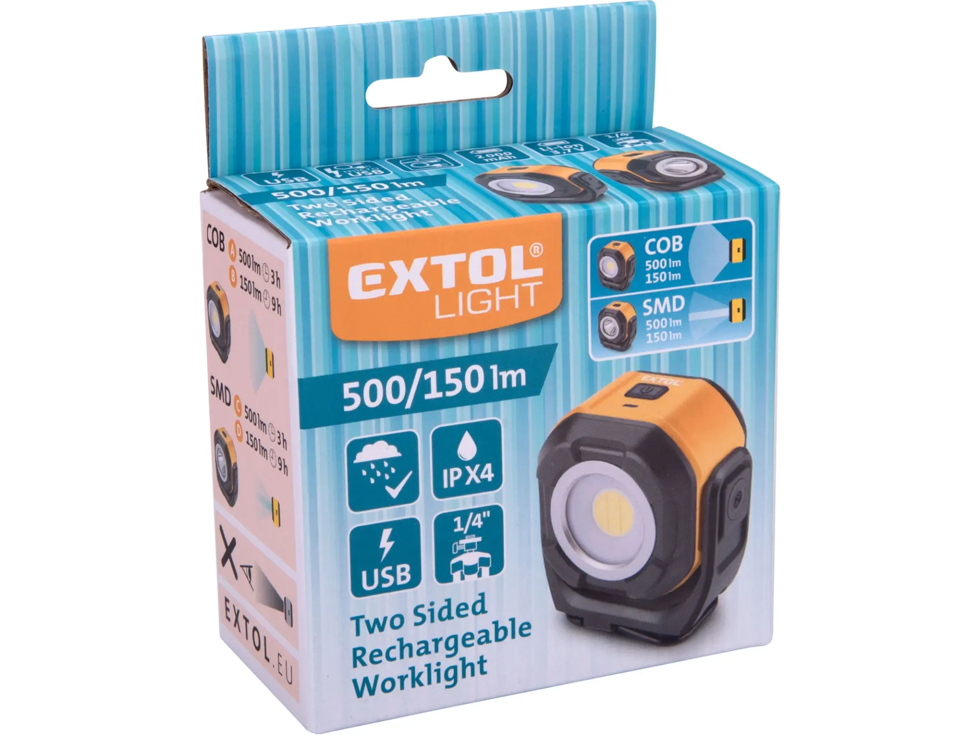 Malý, ale výkonný reflektor s dvěma typy světla. Na jedné straně je 500lm LED dioda pro svícení do dálky a na druhé 500lm COB dioda pro osvit širokého okolí. Vždy svítí jen jedna dioda. Reflektor lze používat jako přenosný zdroj světla se stojánkem bez napájecího kabelu a bez nutnosti připojení ke zdroji el. proudu, protože zdrojem el. energie je předem nabitý akumulátor. Má několik způsobů upevnění — háček, magnet, 1/4" závit pro stativ mu umožňují flexibilní použití. Pokud dáte reflektor na kovový rám dveří, osvítíte s ním celou místnost nebo je velmi užitečný při venkovních opravách auta. Díky malým rozměrům (8x7x5cm), dobré mechanické odolnosti, odolnosti proti dešti a lze svítilnu mít jako součást výbavy automobilu a jako zdroj světla při práci, opravách, kempování, rybaření, na zahradě apod. S USB kabelem lze reflektor nabíjet ze všech běžných nabíječek, 12V auto USB nabíječek, počítačů, powerbank apod.