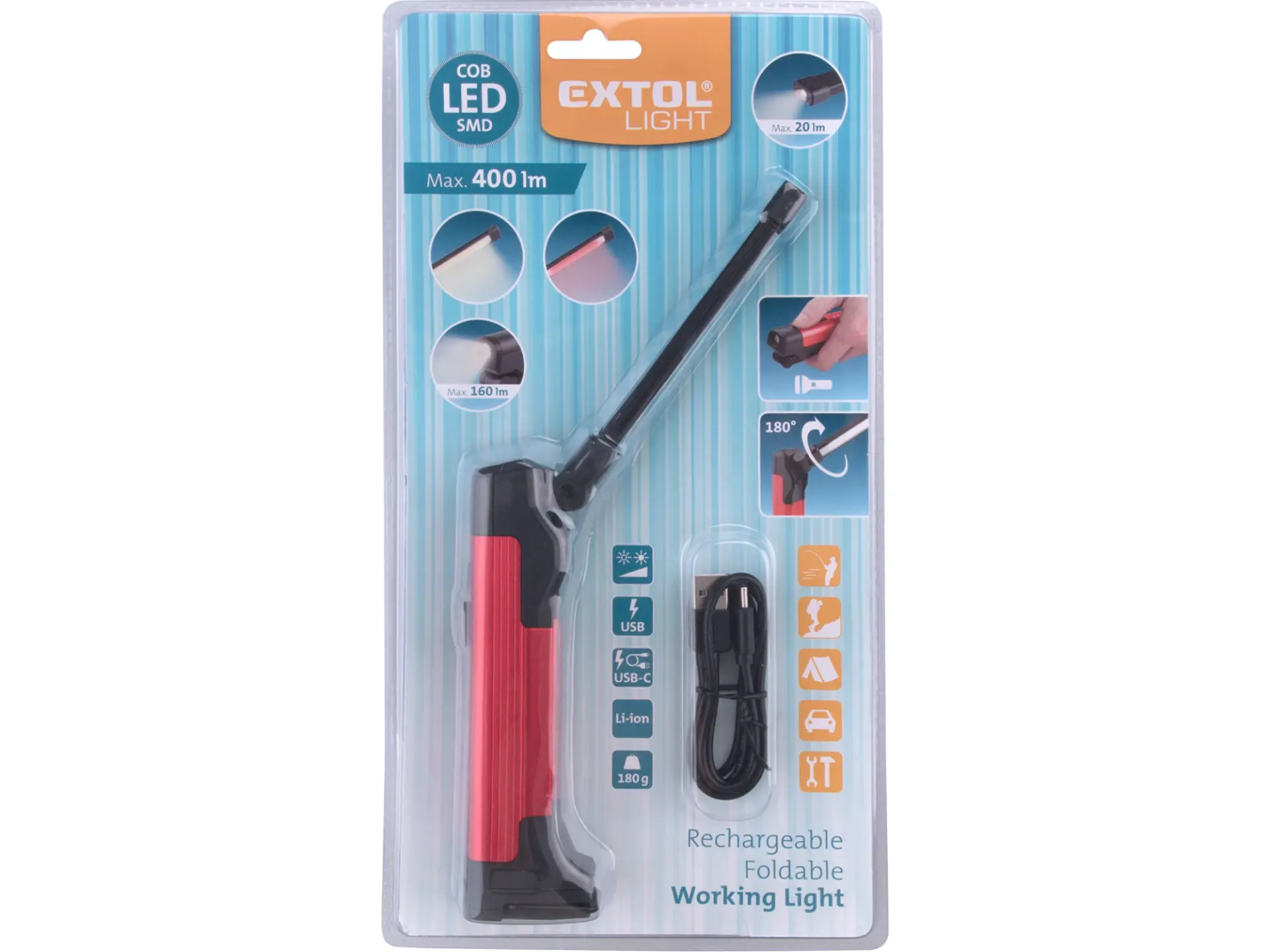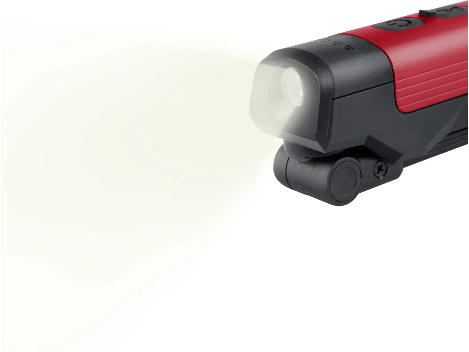 prostorové světlo COB 400lm + svítilna LED 160lm LED + osvětlení LED 20lm, módy světla: prostorové světlo COB 100%–červené–stmívání, svítilna LED 100%–stmívání, osvětlení LED 100%, čas svícení: prosto