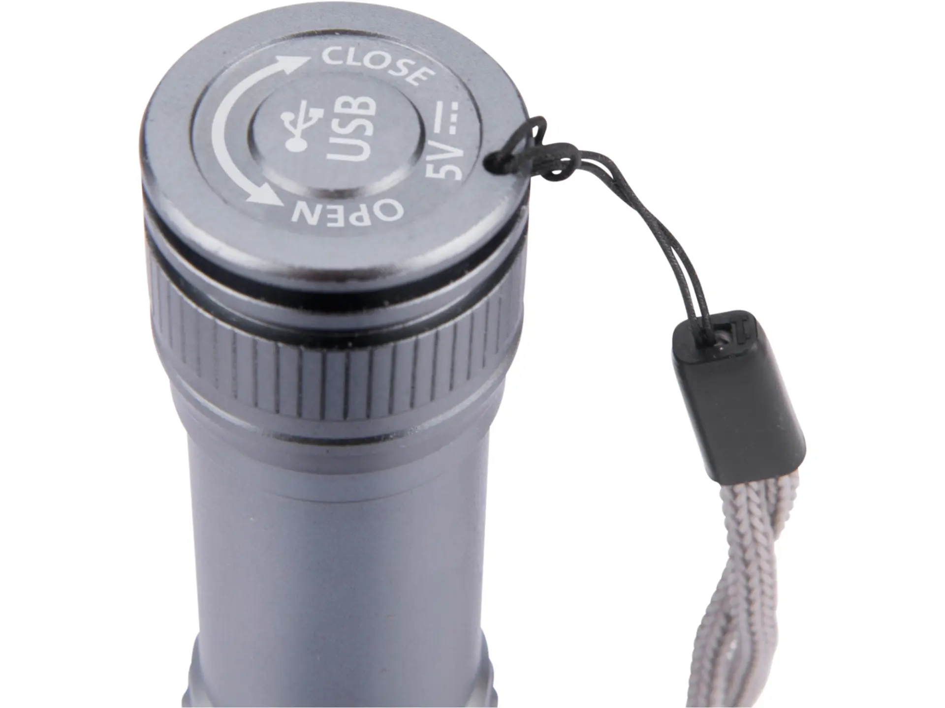 dosvit 370m, 3 módy světla: 100%–30%–blikání, čas svícení: 5–8h, USB nabíjení, baterie: 18650 3,7V Li-ion 2000mAh, délka 11cm, hmotnost s baterií: 92g