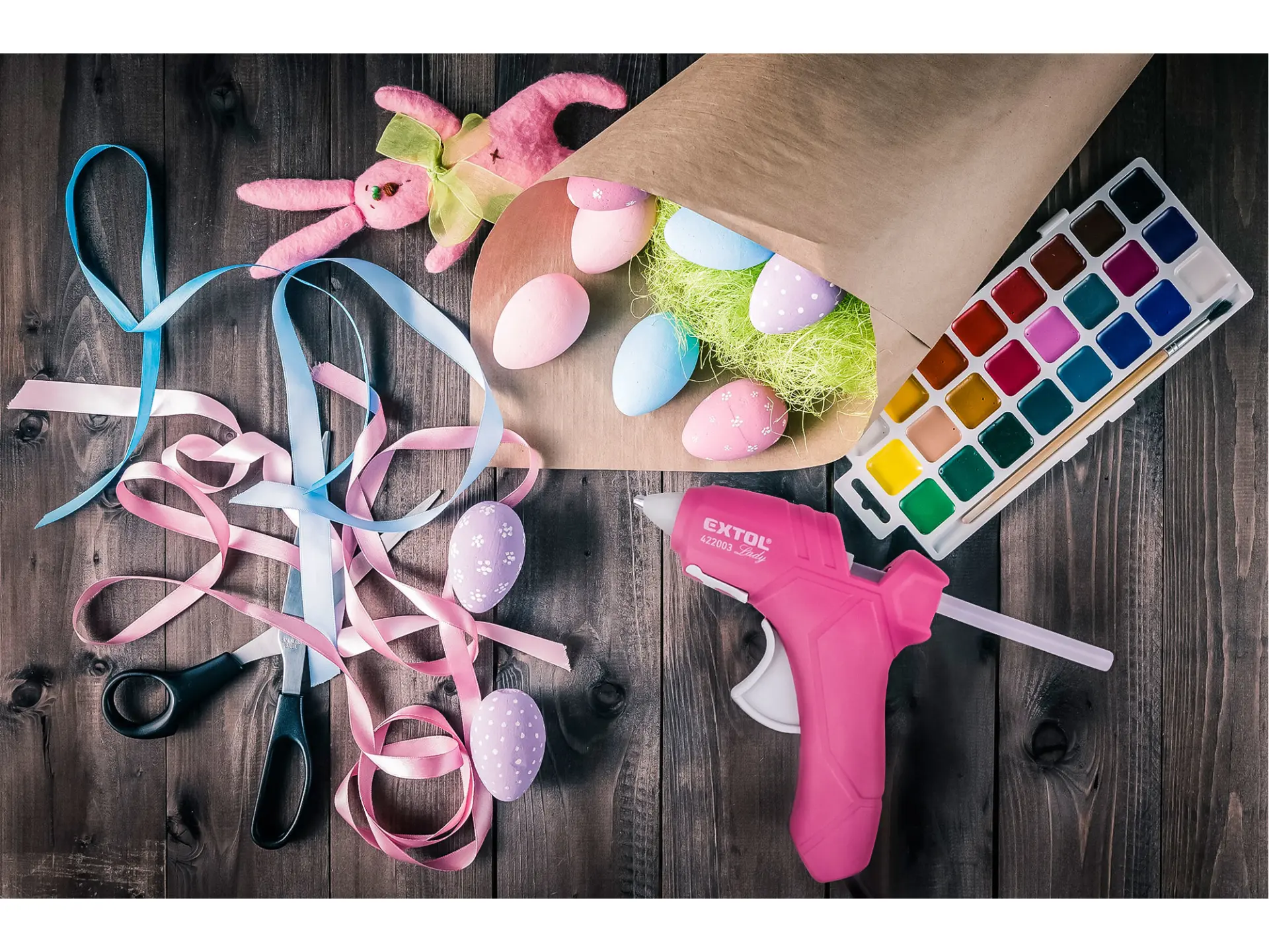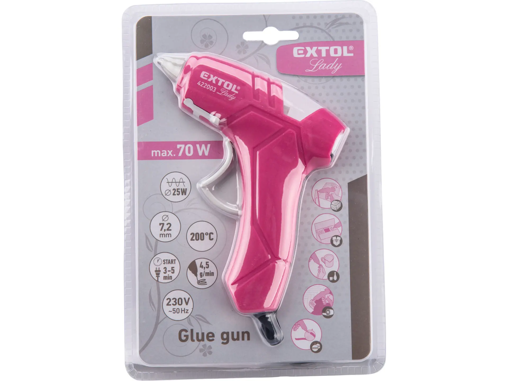 Lepící tavná pistole je určena k rychlému slepení papíru, korku, dřeva, kůže, textilie, umělé hmoty, keramiky atd. Páčka mechanického posuvu umožňuje citlivé, plynulé a přesné dávkování roztaveného lepidla na požadované místo.