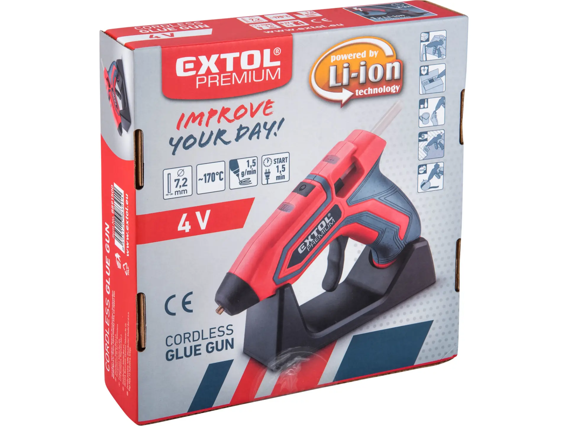 Aku lepící tavná pistole je určena k roztavení a nanášení tavného lepidla za účelem rychlého slepení papíru, korku, dřeva, kůže, textilie, umělé hmoty, keramiky atd. Páčka mechanického posuvu umožňuje citlivé, plynulé a přesné dávkování roztaveného lepidla na požadované místo. Nepřítomnost napájecího kabelu zvyšuje komfort při používání a svobodu při pohybu. Pistole je vybavena nabíjecí základnou do které může položit pistoli v době kdy ji nepoužíváte. Po vložení pistole do základny se pistole začne okamžitě nabíjet a tím se prodlouží doba po kterou ji lze používat. Díky Li-ion akumulátoru je možné pistoli kdykoliv dobíjet, aniž by se tím snižovala kapacita akumulátoru. Li-ion akumulátor ztrácí energii vlivem samovybíjení velmi pomalu a vydrží dlouho nabitý.