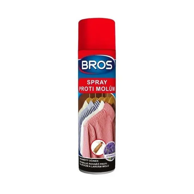 Bros Sprej proti molům 150ml je insekticidní sprej určený k hubení šatních molů, jejich larev a vajíček.