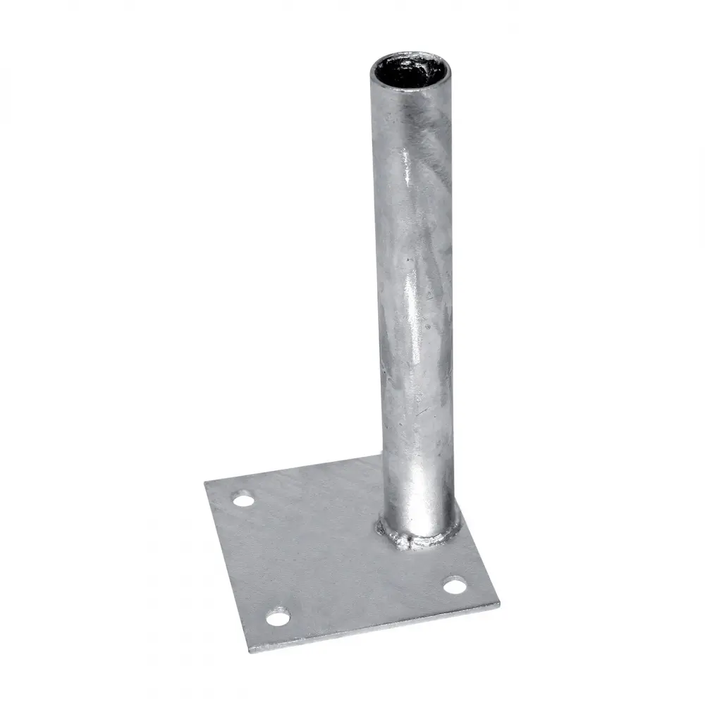Pozinkovaná patka k montáži kulatého sloupku excentrická na betonový základ pro sloupky o průměru 48 mm