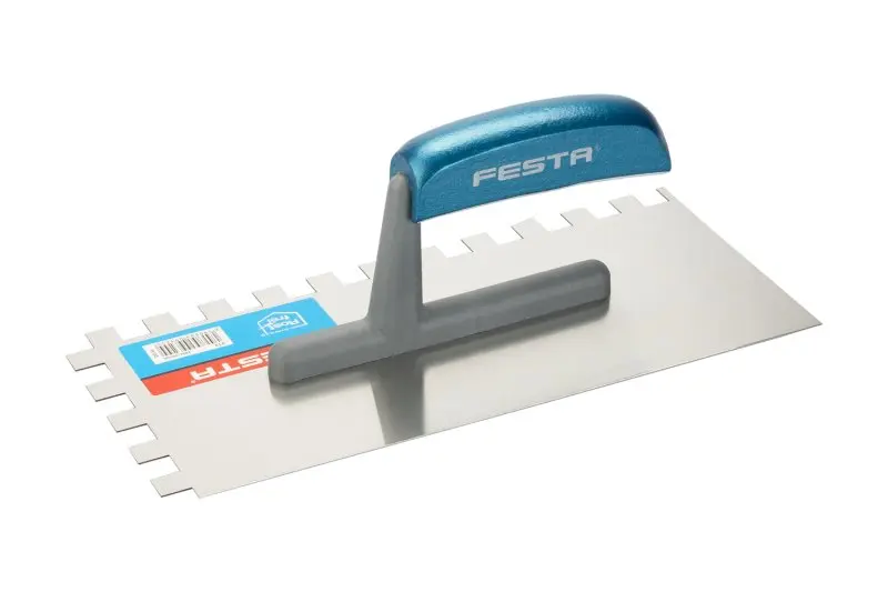 Hladítko nerezové zubové FESTA 280x130 mm, zub e12, s dřevěnou ručkou, tl.plechu 0,8mm. Používá se zejména k nanášení lepidel pod obklady a dlažby, dále pak k nanášení stěrek, štuků, omítek, tmelů a dalších stavebních hmot. Hladítko nerezové zubové umožní natáhnout lepidlo či stavební hmotu v pruzích a výšce dle zubu hladítka.