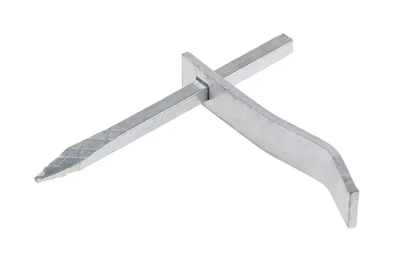 Zednická skoba - pozinkovaná, délka trnu 140 mm, použití : k uchycení desek, příček na kolmých zdech,kulátý dřík umožňuje nastavení plochého ramínka do libovolné pozice.