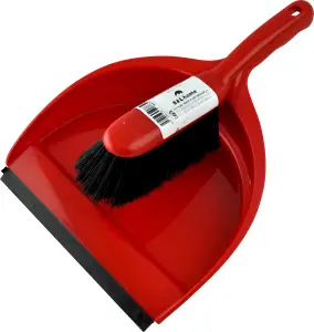 Plastová smetáčková souprava obsahuje plastovou lopatku s gumovou lištou a tvarovanou rukojetí a smetáček s černými štětinami.