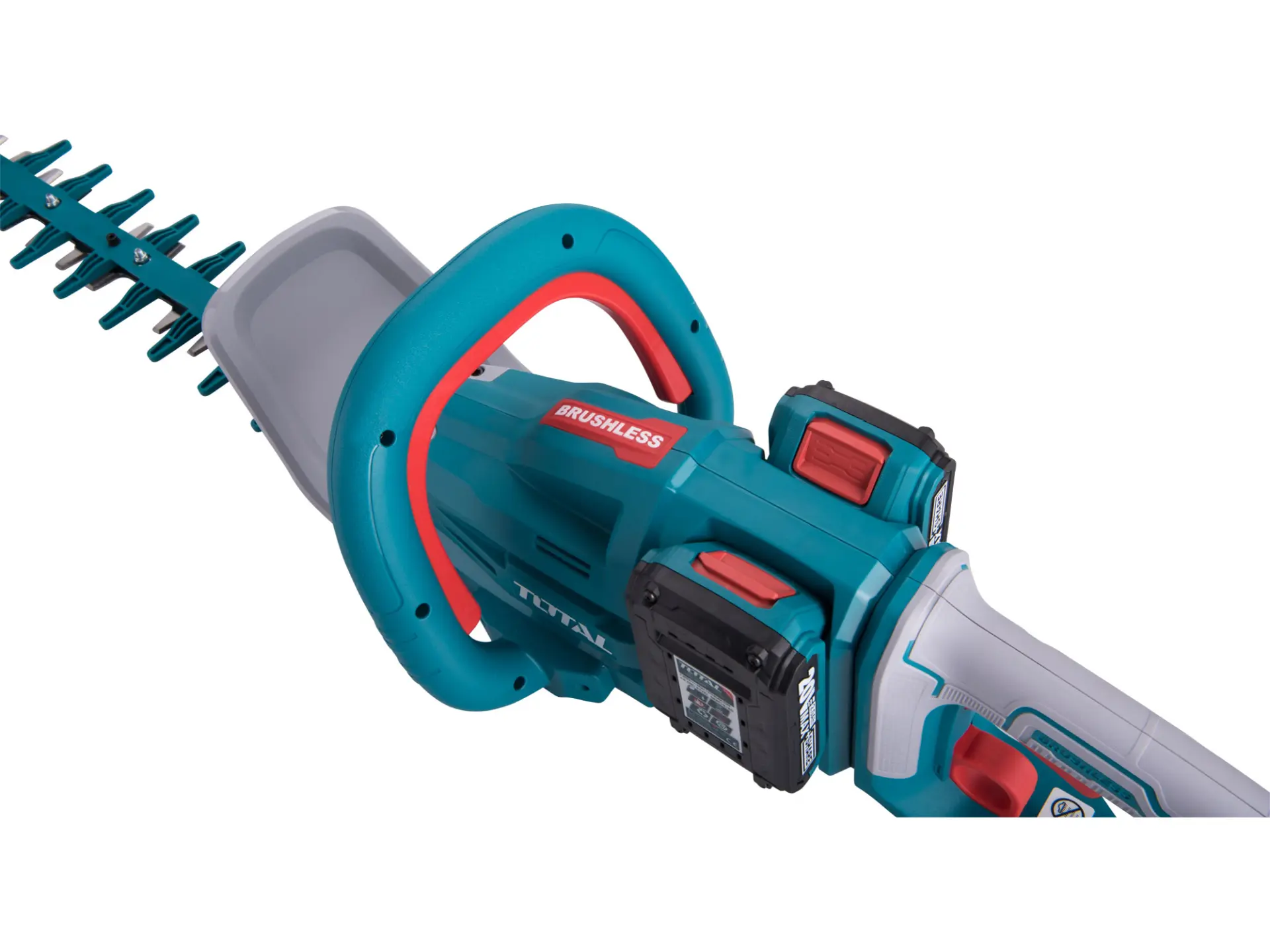 Tyto akumulátorové nůžky jsou určeny ke stříhání živého plotu, keřů, křovin a nově vzrostlých větví v domácích zahradách. Jedná se o novinku společnosti Total. Nůžky jsou napájeny dvěma bateriemi 2000mAh, čímž docílí vyššího výkonu a delší pracovní doby nůžek. Nůžky v sobě mají integrovány 3 pojistky proti spuštění, jsou vybaveny nejmodernějším bezuhlíkovým motorem a pogumovanou rukojetí, která se osvědčila jako protiskluzová. Tyto nůžky jsou součástí populární řady P20S, tedy řady 180 výrobků na jednu baterii. Pokud tedy již vlastníte nějaký bateriový výrobek z řady Total 20V, nemusíte dokupovat k tomuto výrobku baterii a nabíječku. Můžete ji použít z již zakoupeného výrobku. Nepřítomnost napájecího kabelu poskytuje svobodu a komfort při práci a manipulaci s nářadím. Nářadí lze tak s výhodou použít pro práci v místech, kde není možné použít elektrické nářadí s napájecím kabelem z důvodu nedostupnosti distribuční elektrické sítě.