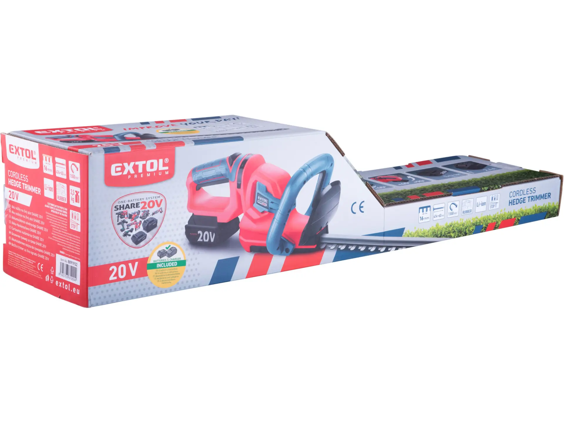 Aku nůžky jsou určeny ke stříhání živého plotu až se středně silnými větvičkami v domácích zahradách. Maximální průměr střihaných větví je 16mm. Ostrá stříhací čepel si snadno poradí s živým plotem a je osazena hliníkovou lištou, která ji chrání před poškozením. Tuto čepel lze otáčet až o 90˚ což usnadňuje stříhání ve vertikální i horizontální poloze. Proti odletujícím kouskům větví je uživatel chráněn pevným plastovým krytem. Stroj je vybaven bezpečnostní pojistkou, která se aktivuje při vyklouznutí z rukou a elektronickou doběhovou brzdou, která zajistí jeho rychlé zastavení. Pogumovaná rukojeť brání vysmeknutí, tlumí vibrace a zpříjemňuje držení při práci. Nůžky jsou navrženy tak, aby byly lehké a ergonomické. Mají dobře vyváženou konstrukci, která snižuje namáhání rukou a zad při delší práci. Díky napájení z baterie již není nutné dávat pozor na napájecí kabel a manipulace s nimi je pohodlnější. Také nikoho nebude rušit hlukem, který vydávají benzínové modely. Aku nůžky nevyžadují složitou péči. Stačí je pravidelně čistit, udržovat ostří čepele a kontrolovat stav baterie. Pro běžnou práci dostačují jeden nebo dva 2Ah akumulátory, které můžete rychle nabít v rychlonabíječce, pro náročnější nebo delší práci doporučujeme větší akumulátory s kapacitou 4–8Ah. Akumulátor má indikátor nabití a lze použít ve všech typech nářadí řady EXTOL SHARE20V. Díky použité Li-ion technologii je ho možné kdykoliv dobíjet, aniž by se tím snižovala jeho kapacita. Li-ion akumulátor ztrácí energii vlivem samovybíjení velmi pomalu a vydrží dlouho nabitý a připravený k použití.