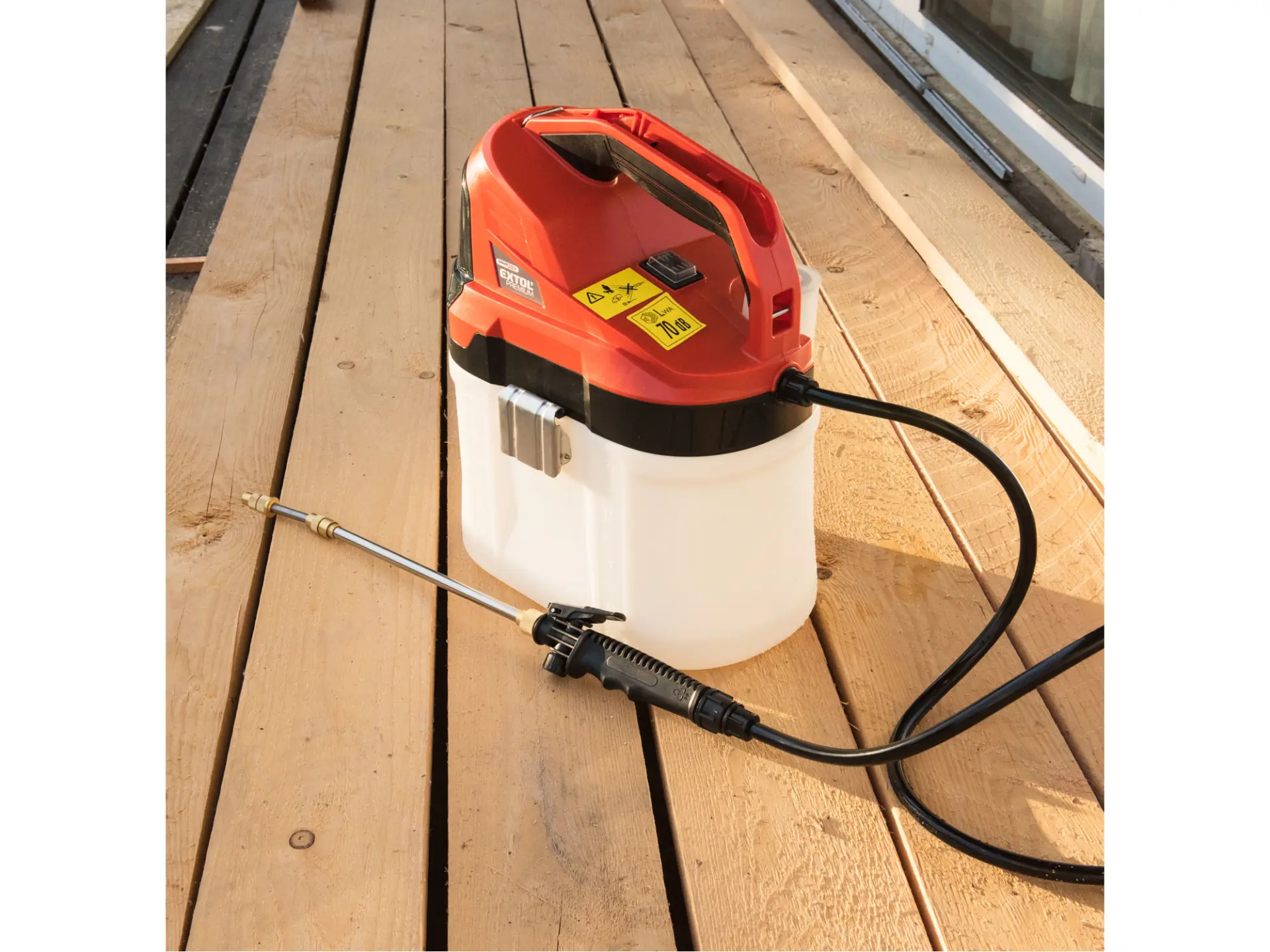 Tlakový aku postřikovač je určen ke stříkání čisté vody pro rosení či zalévání rostlin, naředěných prostředků proti škůdcům rostlin (tj. insekticidů – proti škodlivému hmyzu či fungicidů – proti plísním rostlin) a naředěných prostředků na hubení plevelů (herbicidů) např. na dlažbě terasy a vodných roztoků hnojiv rostlin na zahradách, ve sklenících apod. Postřikovač lze rovněž použít k postřikování ekologicky šetrných ochranných prostředků rostlin s obsahem řepkového nebo nimbového oleje, pokud tyto prostředky obsahují emulgátory oleje, které zamezují oddělení olejové složky ochranného prostředku od vody, čímž vytvářejí jemnou emulzi oleje ve vodě, a tudíž je lze použít pro aplikaci postřikovačem. Není možné ho používat s hustými kapalinami nebo s kapalinami se dvěma oddělenými samostatnými fázemi. Díky napájení postřikovače z baterie je postřikování velice komfortní a baterie má vysokou výdrž (až 236l/2000mAh baterii). Postřikovač lze používat buď zavěšený přes rameno, nebo díky veliké ploše dna, nádobu poponášet. Tryskou lze nastavit režim rozprašování (vějíř) nebo jen paprsek vody s dostřikem až 7,6m, např. pro zalévání. Optimální vzdálenost pro postřik je 60cm od konce trysky. Postřiková trubka s tryskou je teleskopická v rozsahu 32–52cm pro nastavení požadované délky dosahu. Součástí postřikovače je odměrka pro odměření objemu přípravku a také stupnice objemu na nádobě pro naředění přípravku. Spoušť lze zajistit ve stisknuté poloze pro dlouhodobější stříkání. Čerpadlo se automaticky vypne po přerušení stříkání pro delší výdrž baterie. Baterie je před vniknutím vody chráněna v bateriovém prostoru ochranným krytem celého bateriového prostoru. Čerpadlo a tryska v postřikové trubce jsou chráněny před ucpáním pevnými částicemi filtrem na vstupu kapaliny do postřikovače a také v rukojeti. Pro usnadnění skladování nebo při přesunu stroje lze rukojeť stříkací pistole lze vložit do madla postřikovače. Pro běžnou práci dostačují jeden nebo dva 2000mAh akumulátory, které můžete rychle nabít v rychlonabíječce. Akumulátor má indikátor nabití a lze použít ve všech typech nářadí řady EXTOL SHARE20V. Díky použité Li-ion technologii je ho možné kdykoliv dobíjet, aniž by se tím snižovala jeho kapacita. Li-ion akumulátor ztrácí energii vlivem samovybíjení velmi pomalu a vydrží dlouho nabitý a připravený k použití.