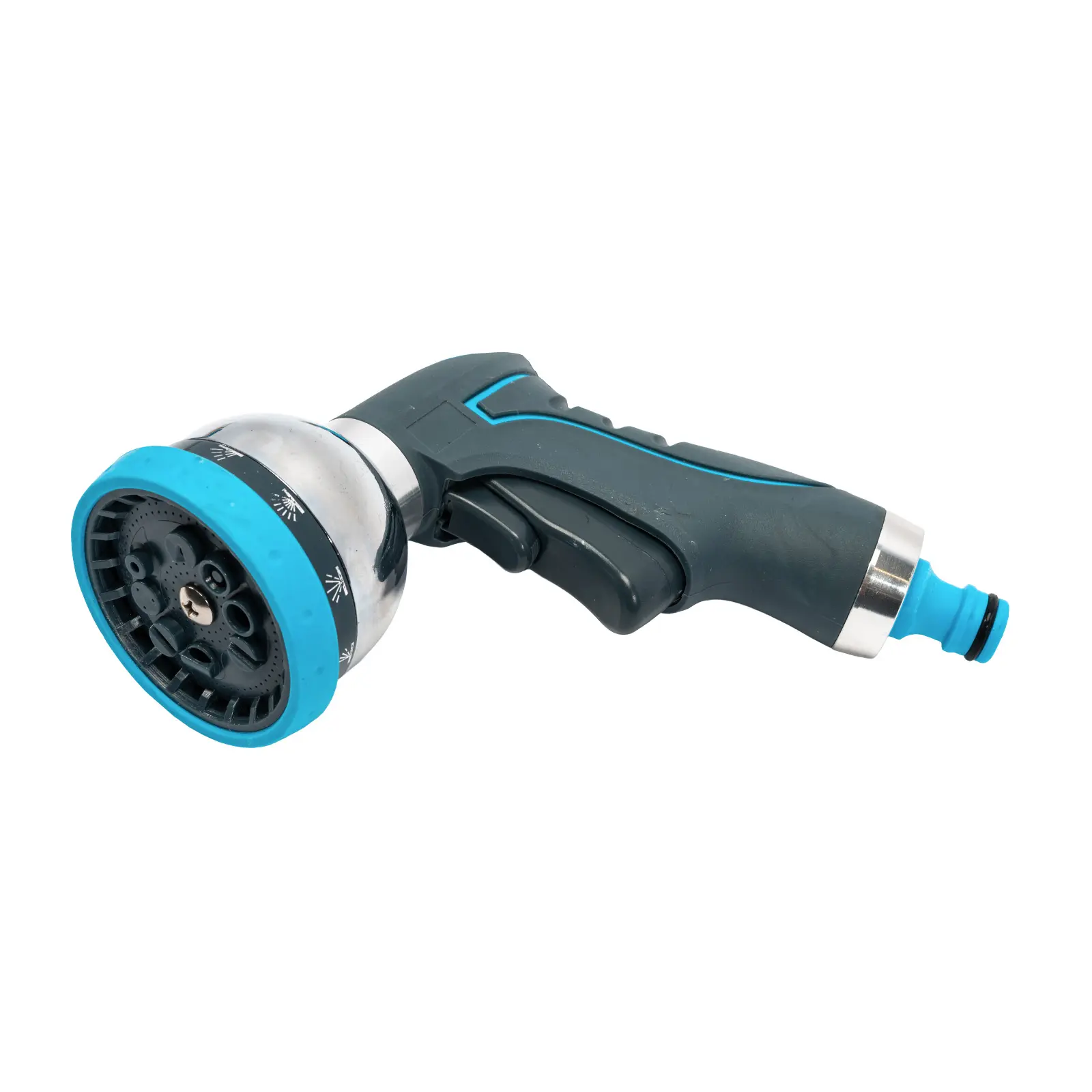 Kovový pistolový rostřikovač masivní konstrukce v kombinaci s plastovými prvky. Má 10 funkcí od jemného zavlažování až po silný proud s možností rychlého přestavení. Aretace spouště pro trvalý postřik.