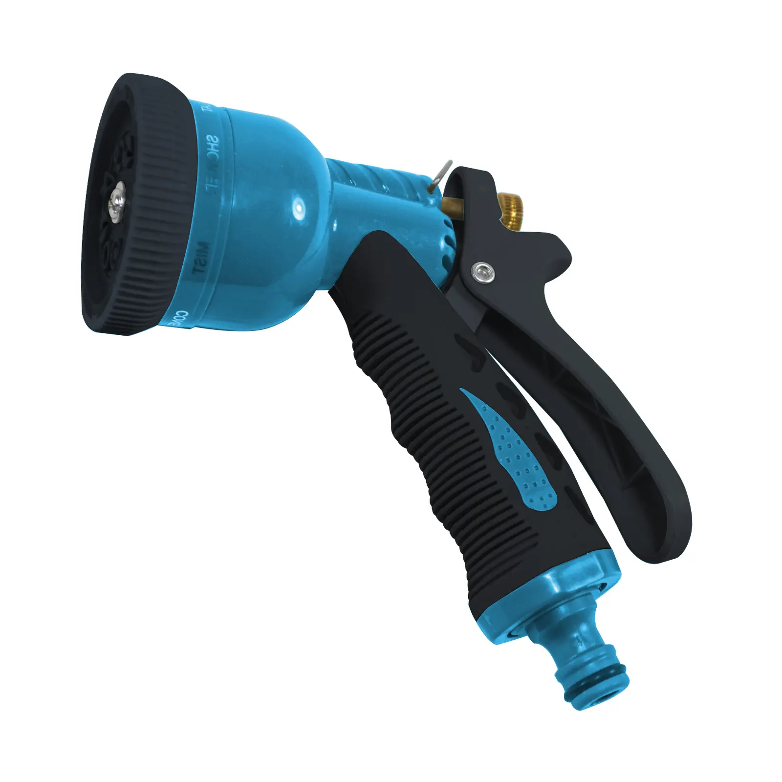 Hadicový postřikovač s pogumovanými prvky proti prokluzu. možnost regulace průtoku vody a aretace spouště.