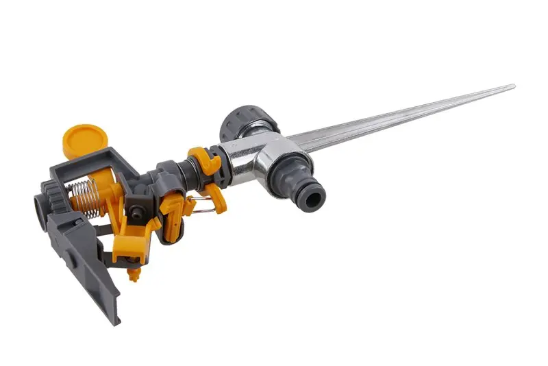 Hrotový dvoucestný impulzní zavlažovač s přípojením hadicovou rychlospojkou, plast/kov. Min.70 kPa a max.550 kPa.