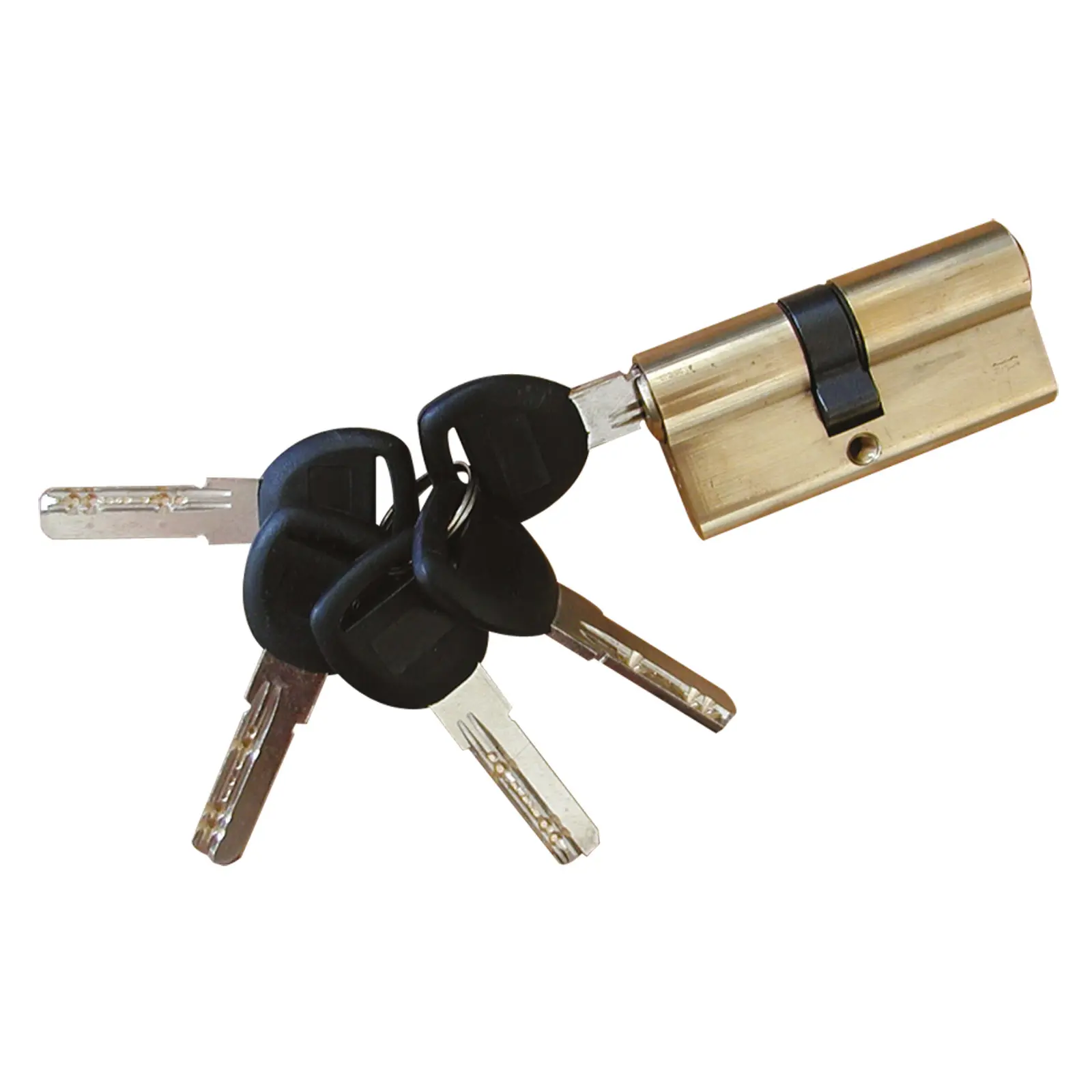 Mosazná bezpečností stavební vložka 30/35. Pět oboustranných klíčů se speciálním výbrusem, který lze jen těžko kopírovat. Mechanismus pěti stavítek, které se postupně zasouvají zvyšuje odolnost vložky proti odvrtání.