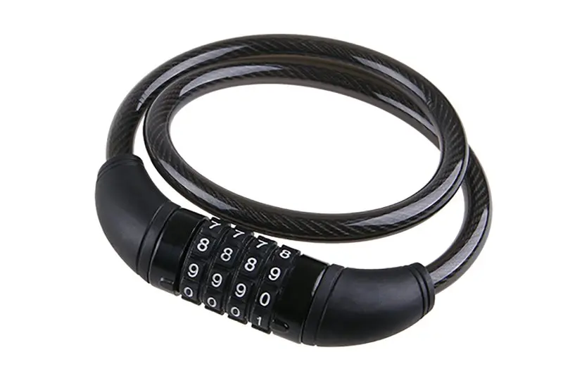 Snadno přenosný. Zamykání na kód pomocí kombinace 4 čísel. Snadno připevnitelný ke kolu pro přepravu. Materiál: flexibilní vinuté ocelové lanko potažené vinylem.