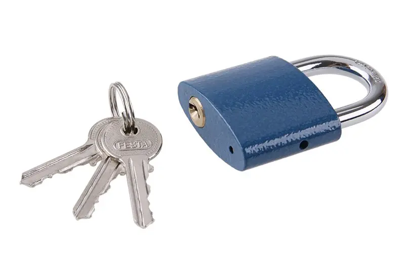 Ocelové tělo zámku, Mosazná vložka, Váha: 187g, 3 klíče, Zesílený oblouk z tvrzené oceli pro lepší odolnost proti prořezání.