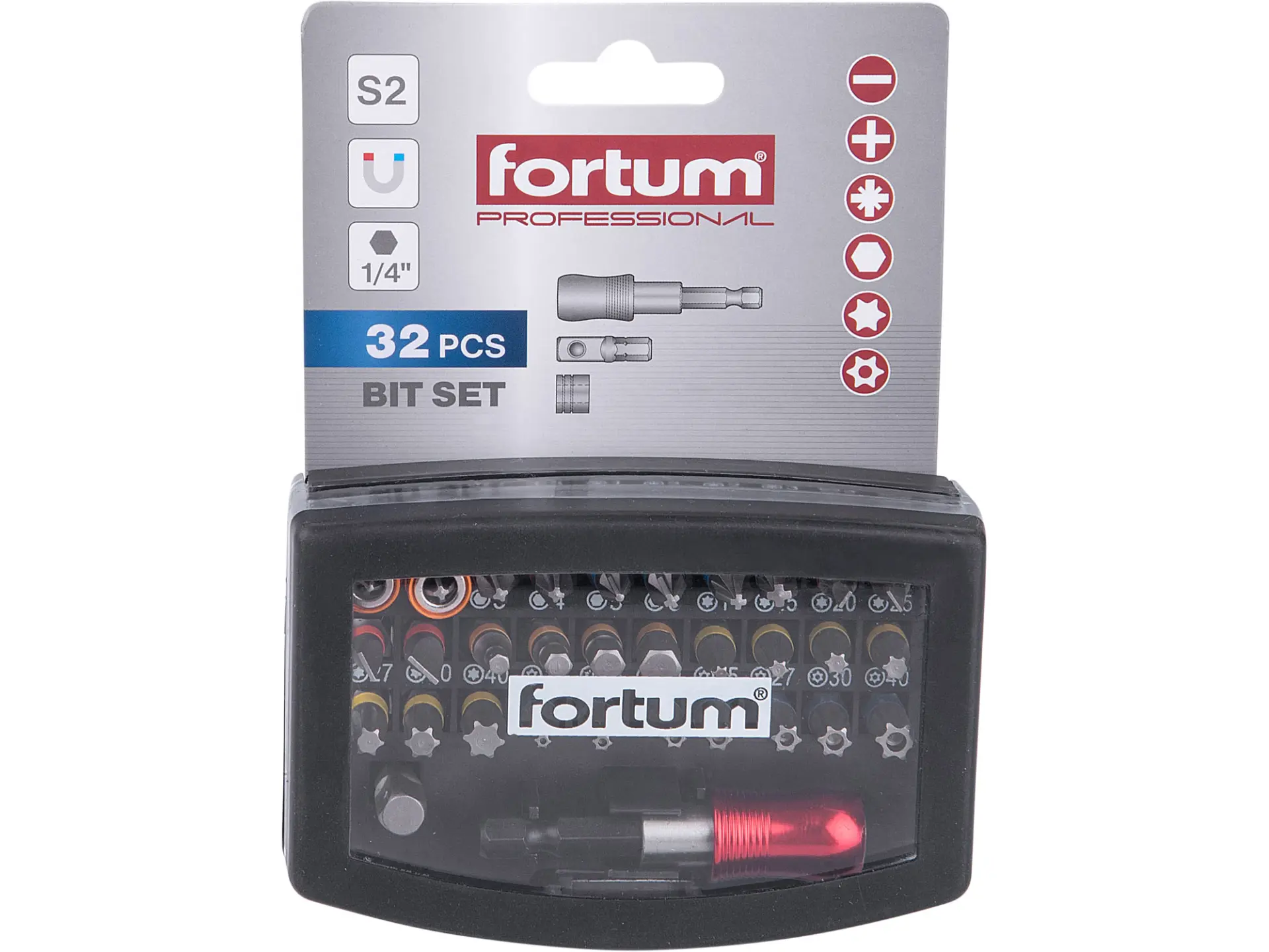 (-) 3-4-5-6mm, PH 1-2-2-3, PZ 1-2-2-3, HEX 3-4-5-6mm, T 10-15-20-25-27-30-40, TTa 10-15-20-25-27-30-40, magnetický držák hrotů Fix-Clip 65mm, adaptér: 1/4"čtyřhran-1/4"hex