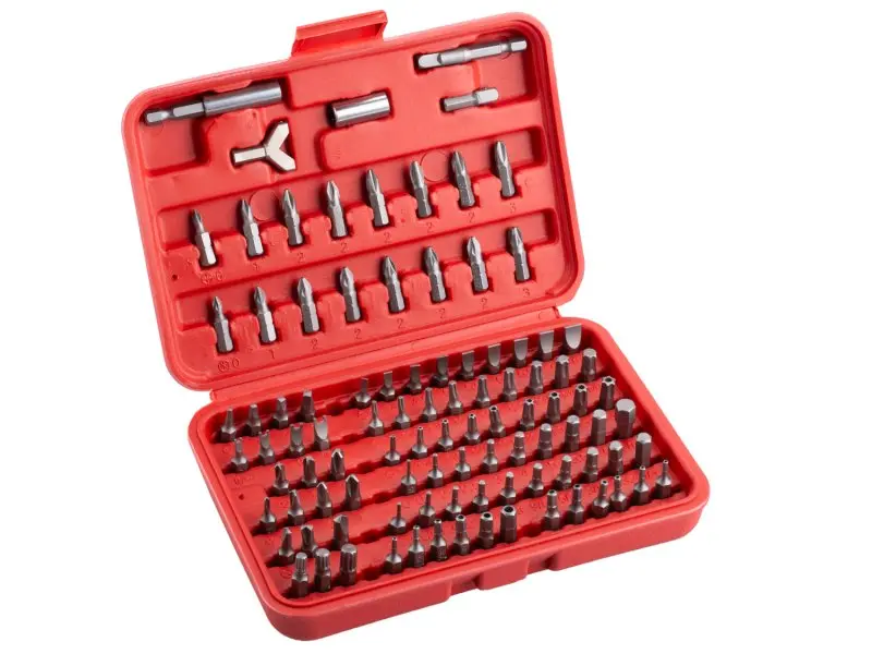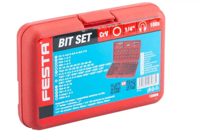 Sada bitů 100ks, CrV ocel. Sada obsahuje: SQ, PH, PZ, S, T, Tta, H, Hta, SD, TS, TW, 5/32, 3/16, XZN. Magnetický nástavec na bity. Nástavec Y. 1/4 DR nástavec na šroubovák. 1/4 bit adapter: 25mm, 50mm.