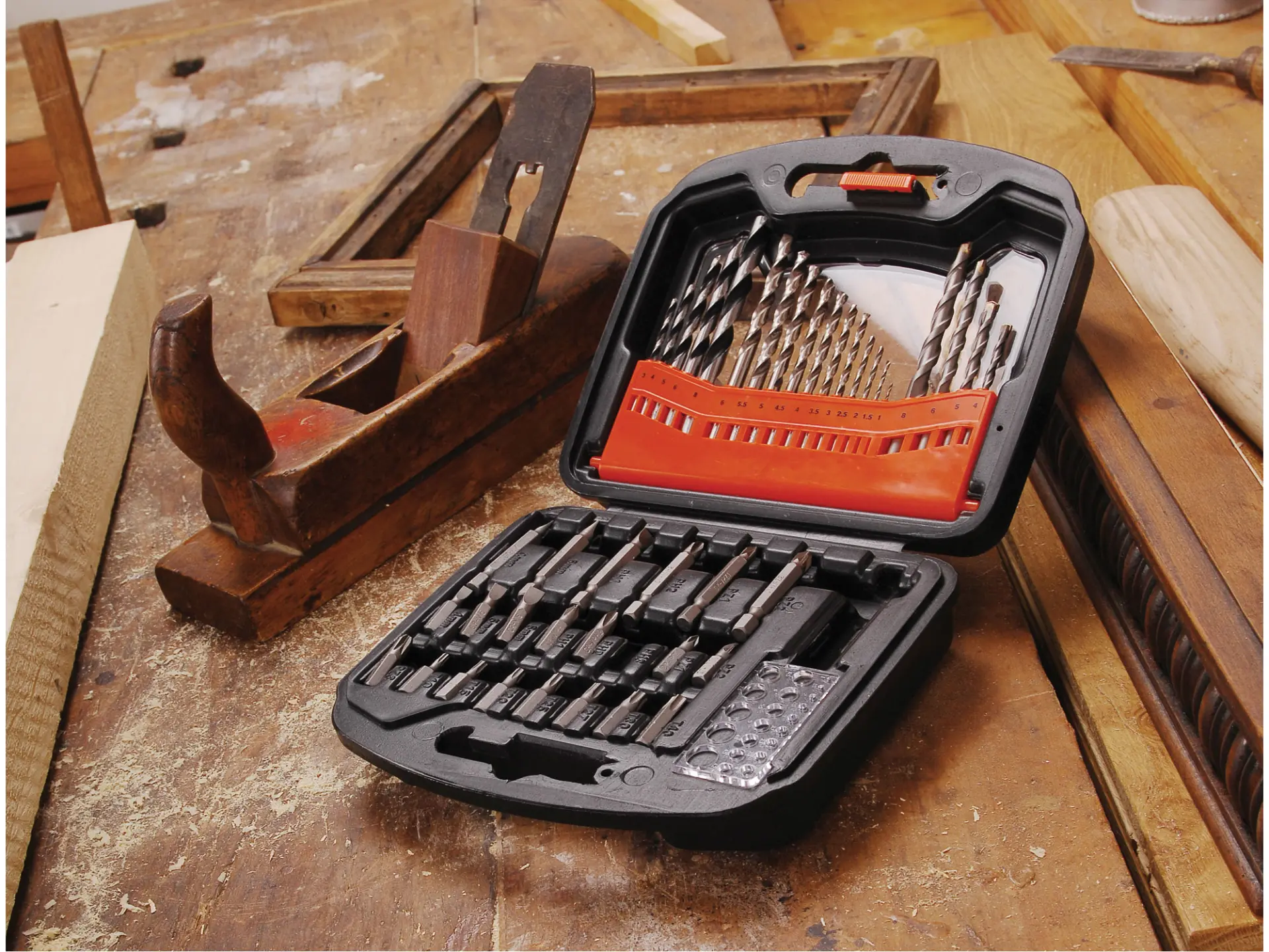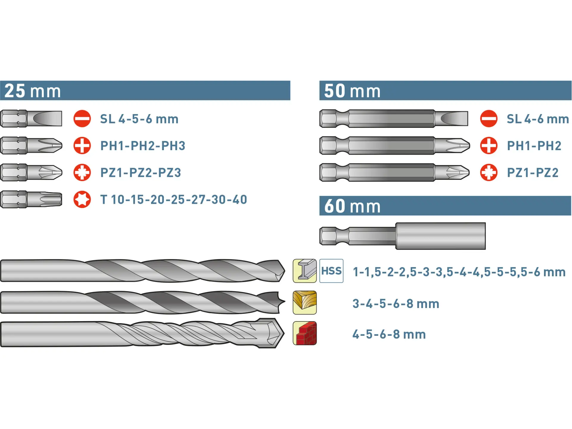 vrtáky do kovu: O 1-1,5-2-2,5-3-3,5-4-4,5-5-5,5-6mm, vrtáky do dřeva: O 3-4-5-6-8mm, vrtáky do zdiva: O 4-5-6-8mm, hroty: 1/4"x25mm (-) 4-5-6mm, PH1-2-3, PZ1-2-3, TORX10-15-20-25-27-30-40