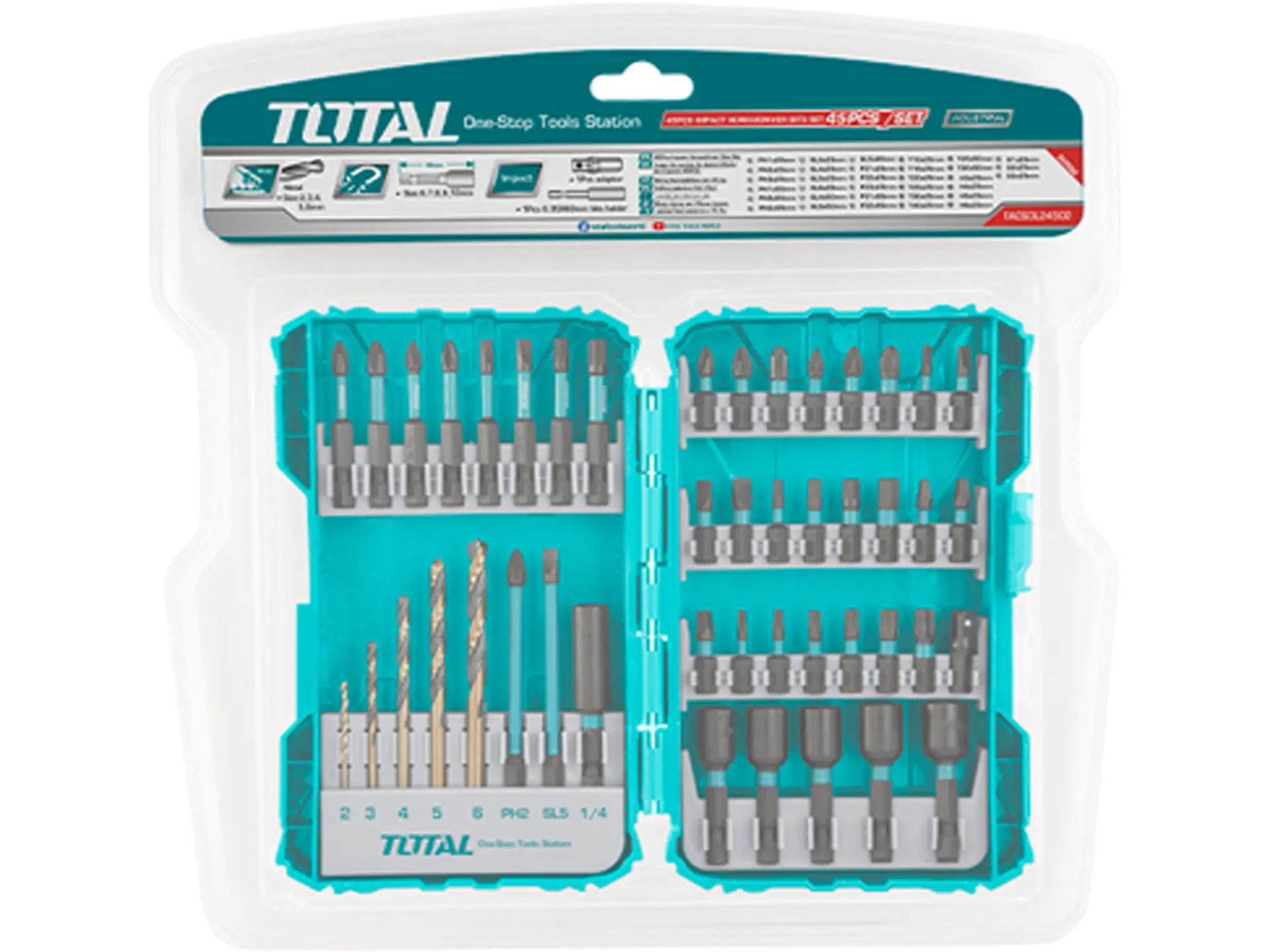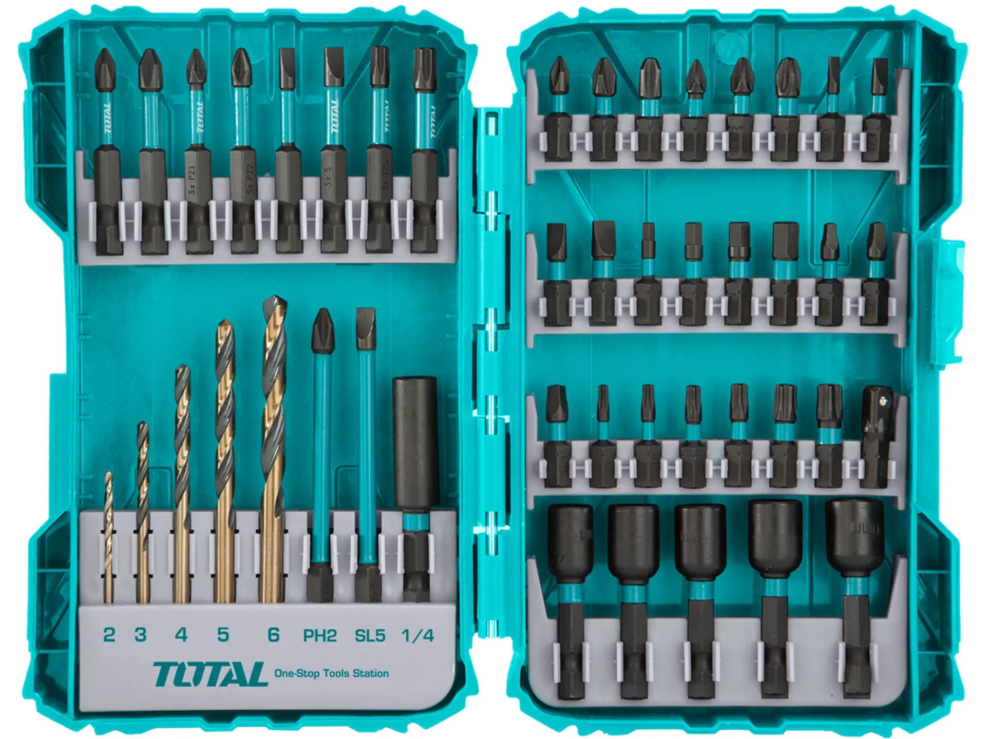 8ks 50mm hrotů, 23ks 25mm hrotů, 1ks adaptéru, 2ks 89mm hrotů, 5ks HSS vrtáků 2-6mm, 5ks 48mm magnetických ořechů 6-10mm, 1ks adaptéru
