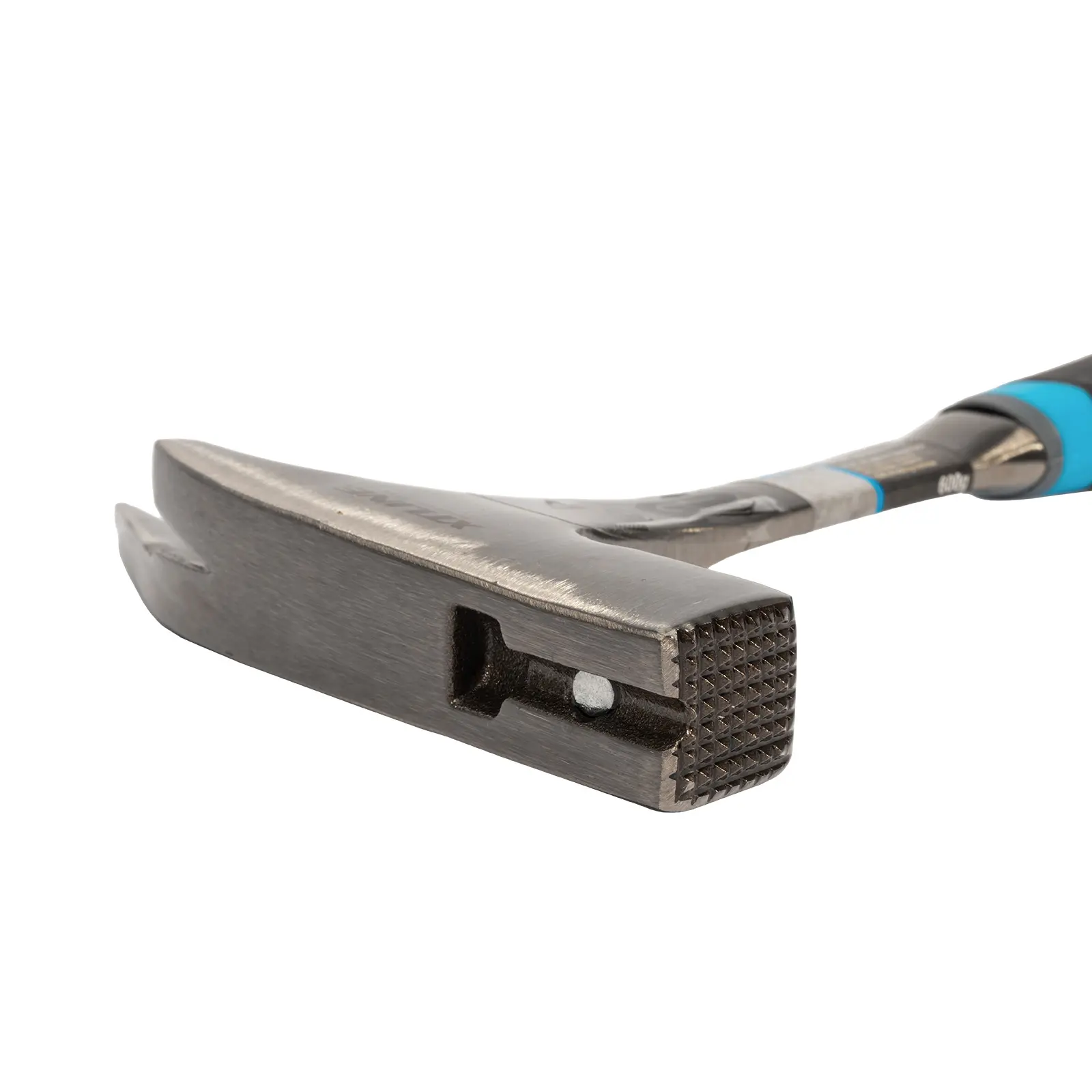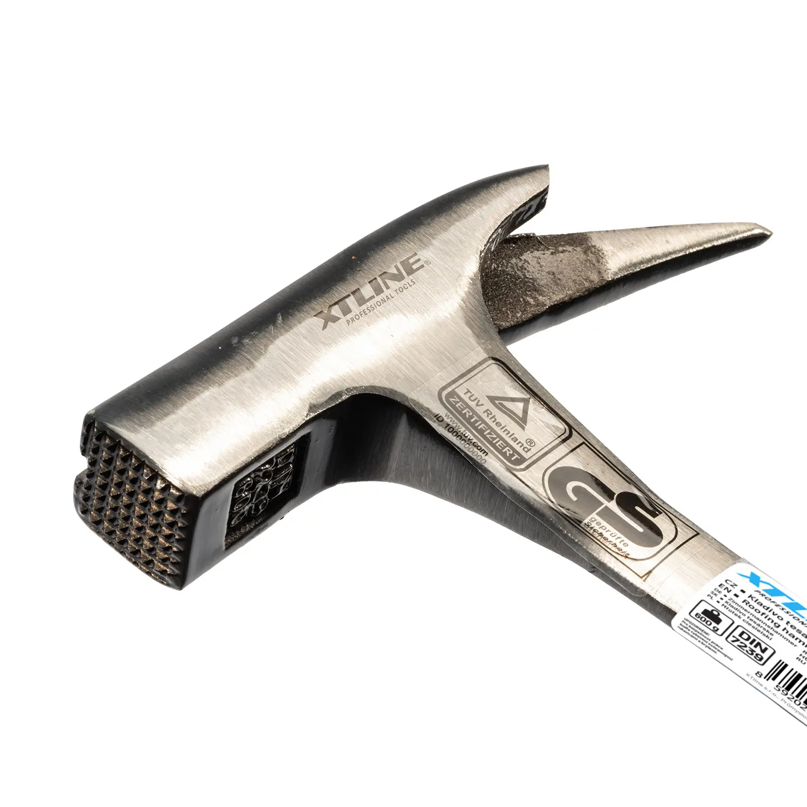 Kladivo pro pokrývače a tesaře s trhacími čelistmi. Vhodné pro odstraňovaní starých podlah, dřevěných konstrukcí apod. Magnetický držák hřebíků pro usnadnění práce. Tělo kladiva je vyrobeno z jednoho kusu oceli. Plastová rukojeť s pogumováním v místě, kde je předpokládán možný prokluz. Čep drží násadu na svém místě.