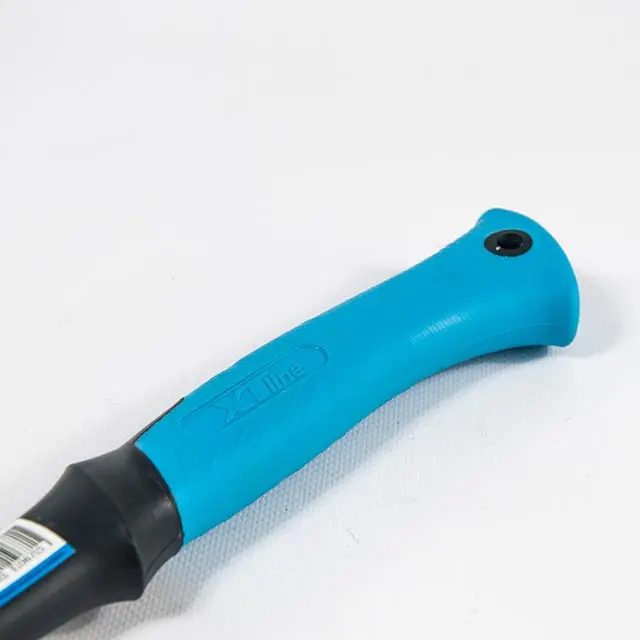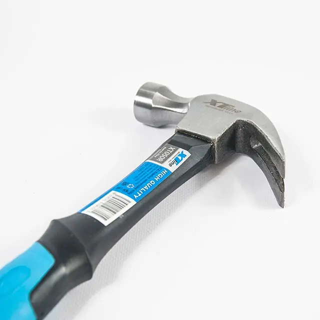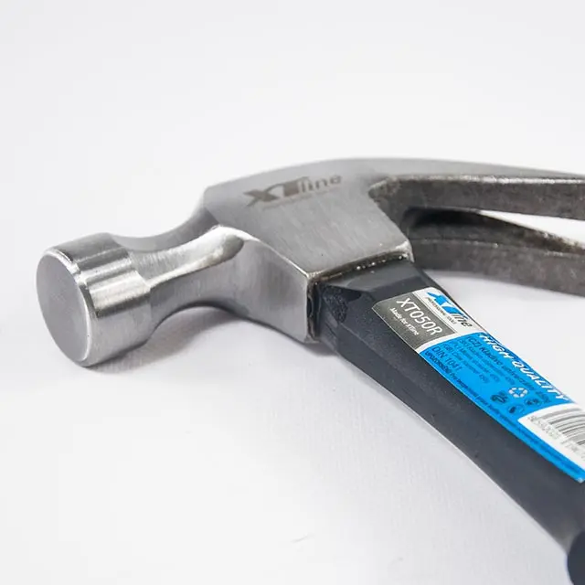 Kladivo s trhacími čelistmi, kulatá hlava s drážkami pro snadné zatloukání hřebíků, pogumovaná sklolaminátová násada.
