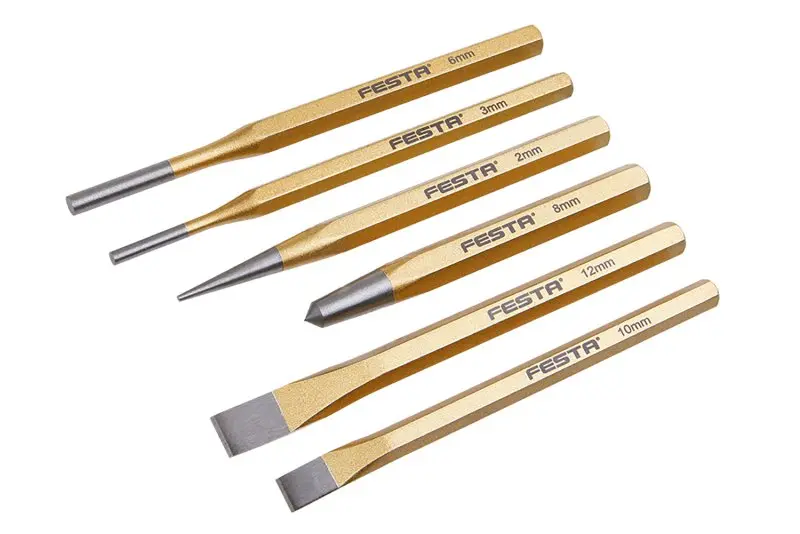 Sada sekáčů, dulčíků a průbojníků FESTA vyrobena z chrom vanadové oceli. Sada obsahuje 6 ks dulčík: 2x140, 8x115mm, sekáč: 12x152, 10x142 , průbojník: 3x152, 6x152 .