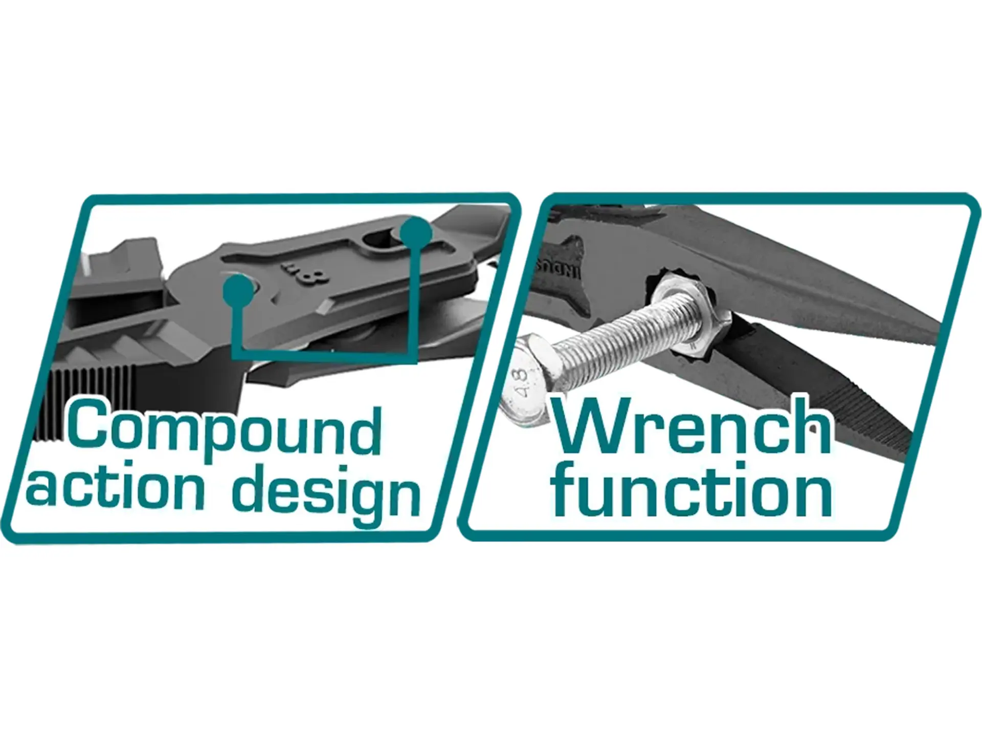 Velikost: 8,5"/215 mm, Úspora energie 65% než běžné kleště, Materiál: Cr-V, Povrchová úprava: teflonový povlak TPR tříbarevná rukojeť pro pevné uchopení a pohodlí. S funkcí klíče. S funkcí odhrotování