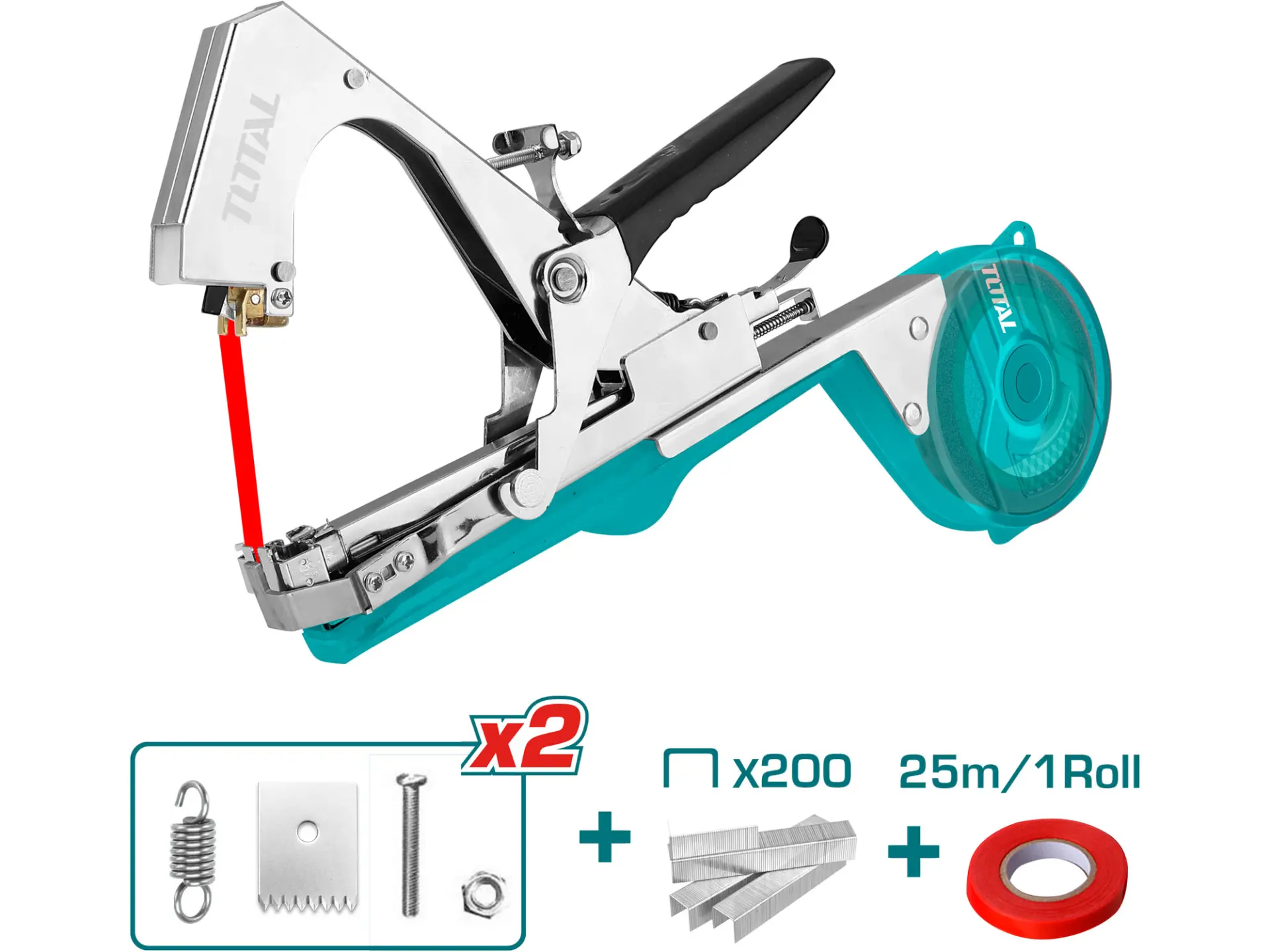 Kleště na vázání rostlin, Velikost: 32cm, Velikost pásky: W11mmxL25~30MVelikost spony: C7 mm x D4 mm x W0,55 mm, Ovládání jednou rukouRozevření páskového kruhu lze upravit, Použitelné na všechny druhy větví, plodiny vinné révy, jako jsou hrozny, rajčata, okurky, meloun, lilek. S 1 kusem strečové zahradní kravatové pásky W11mmxL25m, S 200 sponami 7mmxL4mmxW0,55mm.S 1 sadou náhradních dílů včetně: 1 ks čepele, 1 ks pružiny, 1 ks šroubu, 1 ks matice