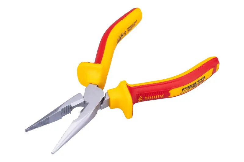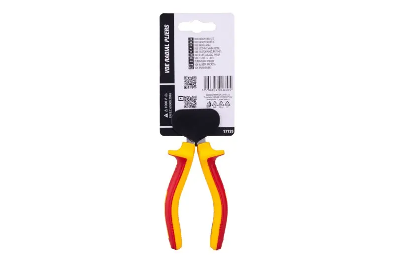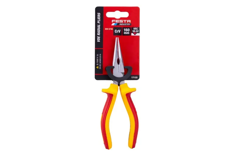 Kleště VDE radiové 160 mm FESTA mají certifikaci elektro VDE 1000 V, IEC/EN 60900-2004, kombinace polypropylenu a pryže na ergonomicky tvarovaných ručkách zaručuje výborné antiskluzové vlastnosti a dobrou odolnost vůči mazadlům a chemikáliím. Uchopovací čelisti obzvláště odolné proti opotřebení, chromvanadová vysoce výkonná ocel. Hmotnost 0,233 kg.