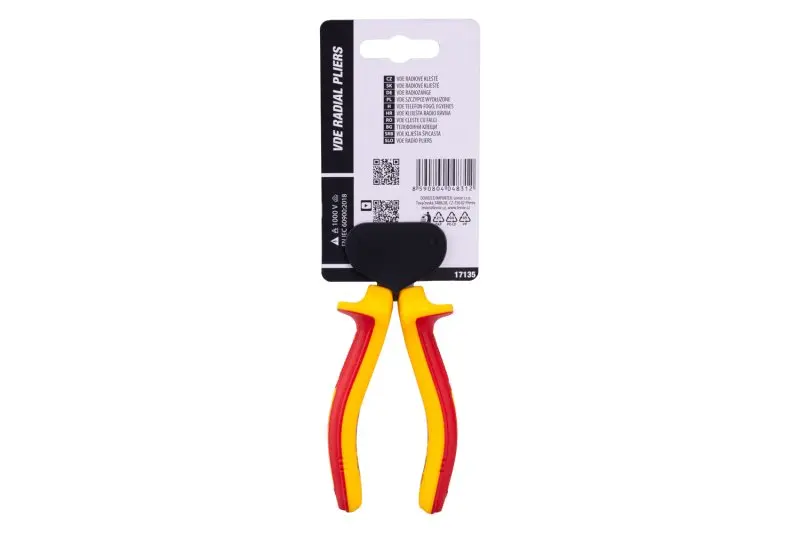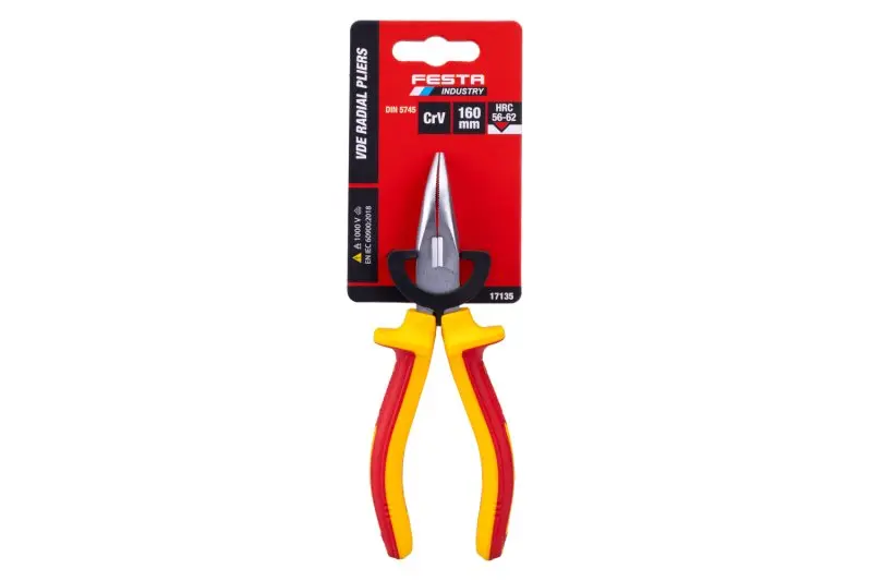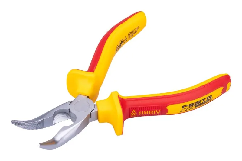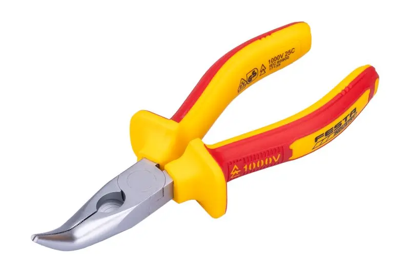 Kleště VDE radiové zahnuté160 mm FESTA mají certifikaci elektro VDE 1000 V, IEC/EN 60900-2004, kombinace polypropylenu a pryže na ergonomicky tvarovaných ručkách zaručuje výborné antiskluzové vlastnosti a dobrou odolnost vůči mazadlům a chemikáliím. Uchopovací čelisti obzvláště odolné proti opotřebení, chromvanadová vysoce výkonná ocel. Hmotnost 0,233 kg.