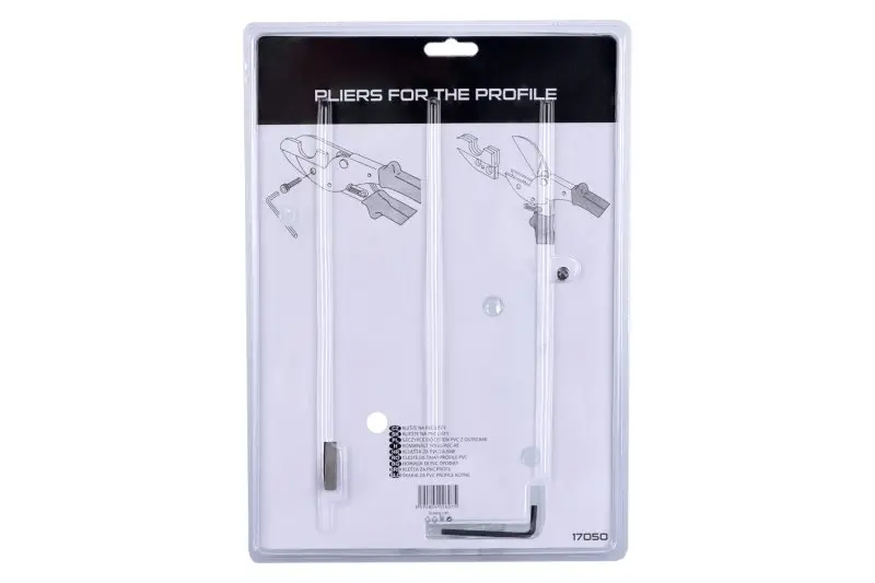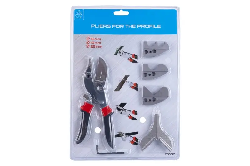 Kleště na PVC lišty a trubky, kleště s kaleným ostřím a výměnnými čelistmi, pro střihy PVC lišt s nastavitelnými úhly a PVC trubky, ergonomické rukojeti, blistr.