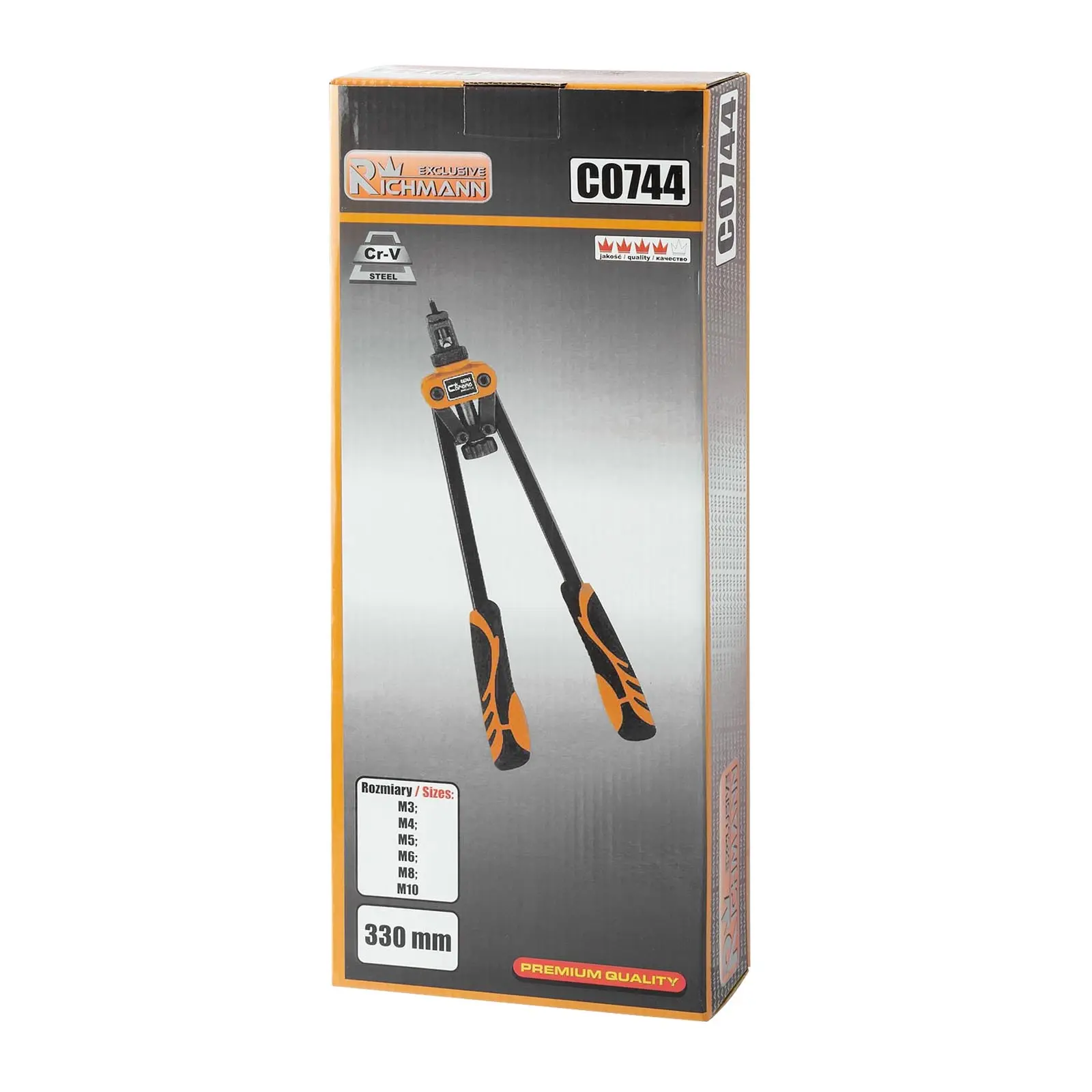 Obouruční pákové nýtovací kleště pro nýtovaní standardními nýty nebo nýtovacími maticemi. Pákový převod snižuje fyzickou námahu. Robustní tělo kleští pro dlouhou životnost. Protiskluzové pogumované rukojeti.
